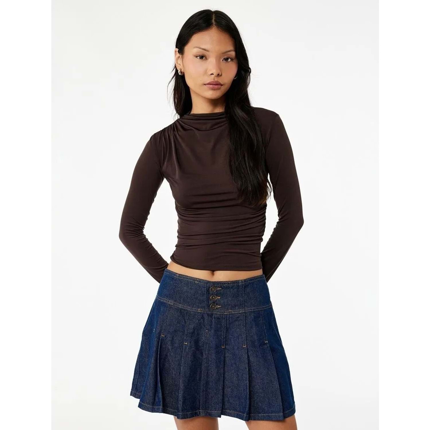 Kadın Giyim Drape Detaylı Dar Kesim Uzun Kollu Tişört - KOTON - 6WAL10251IK - KAHVERENGİ - XS