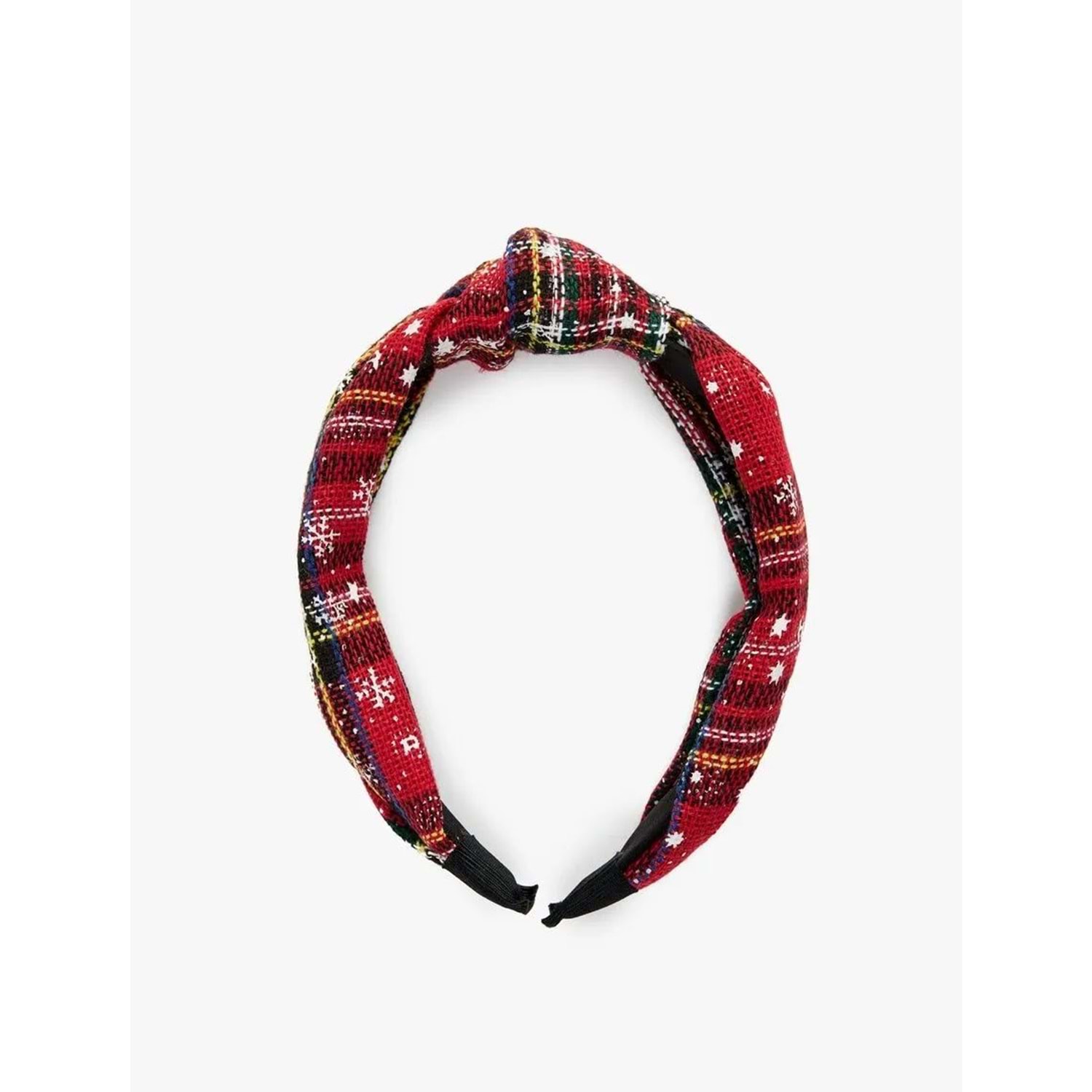 Ekoseli, düğüm detaylı, kar desenli yılbaşı tacı.