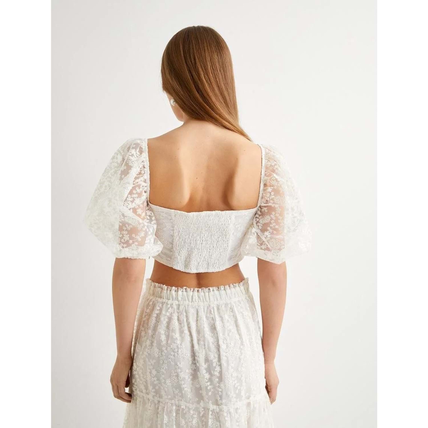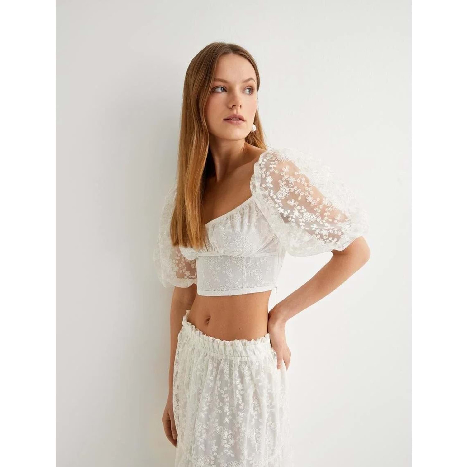 Crop Dantelli Bluz Balon Kollu Kare Yaka - KOTON - 4SAK80346EK - EKRU - S