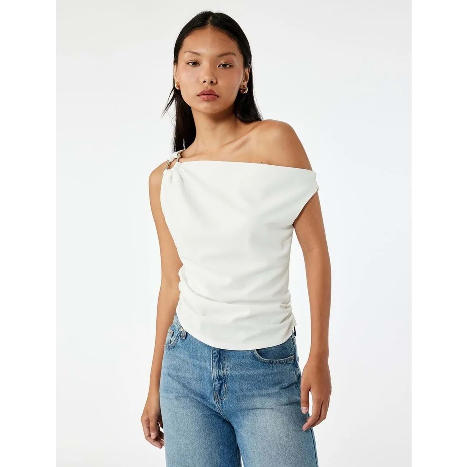 Kadın Giyim Slim Fit Metal Aksesuarlı Drapeli Asimetrik Yaka Kolsuz Bluz - KOTON - 6WAL30038IK - EKRU - M