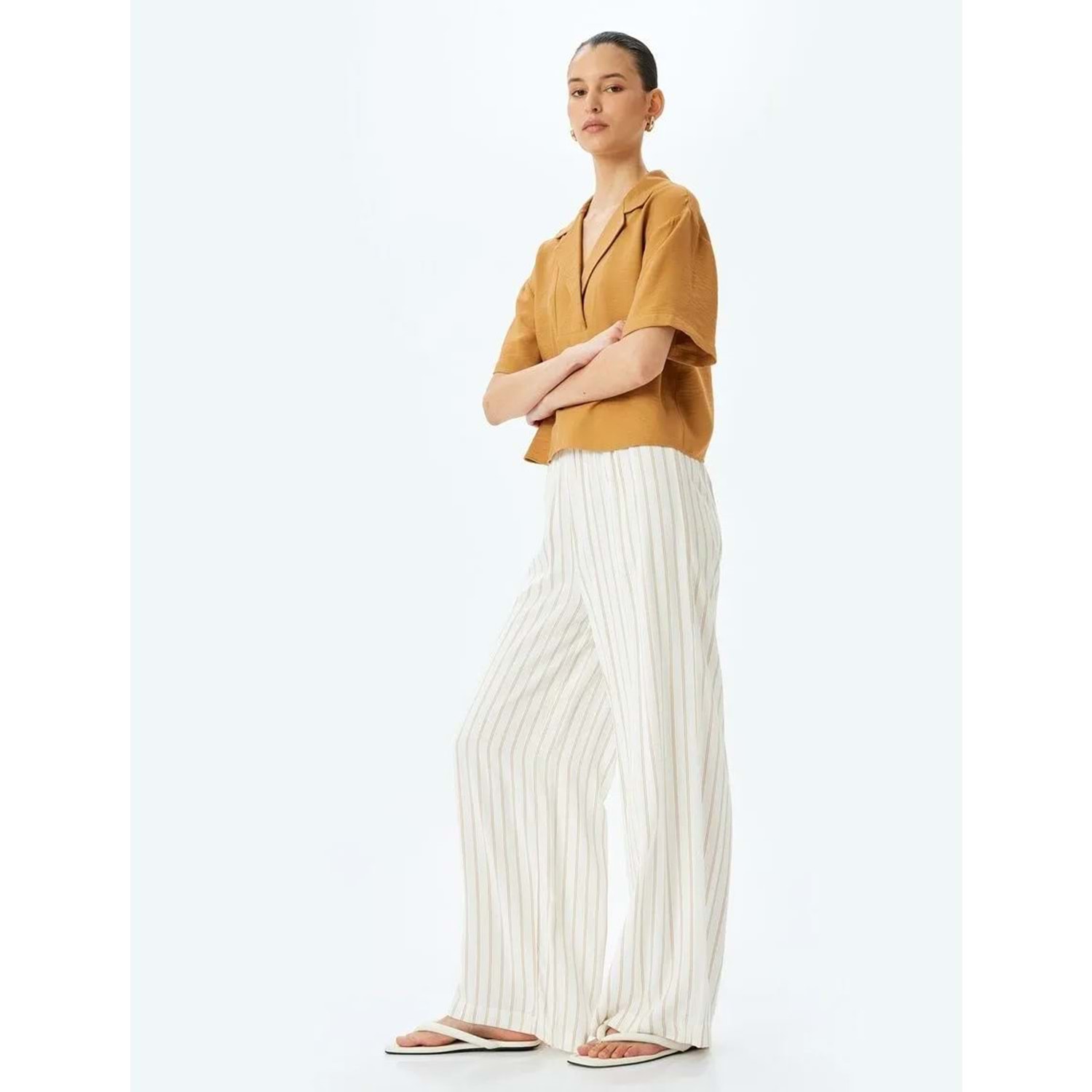 Polo yaka kısa kollu bol kesim bluzu, yüksek bel keten pantolon ve topuklu sandaletlerle kombinleyerek, modern ve sofistike bir görünüm elde edebilirsiniz. Gündüzden geceye uyarlanabilir bu kombin, ofis sonrası akşam planları için de oldukça uygun olacak. Görünümünüzü taze bir makyaj ve zarif aksesuarlarla tamamlayarak her ortamda fark yaratabilirsiniz.