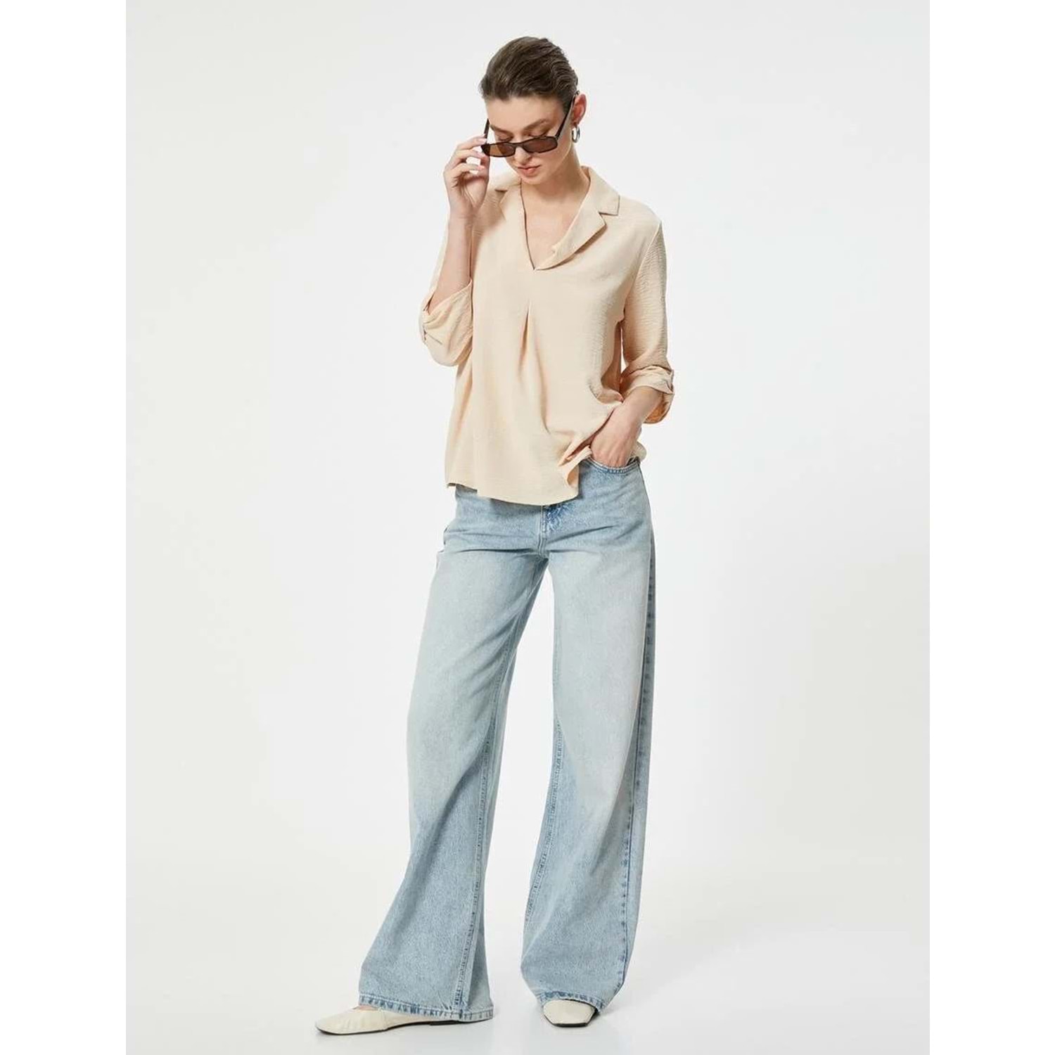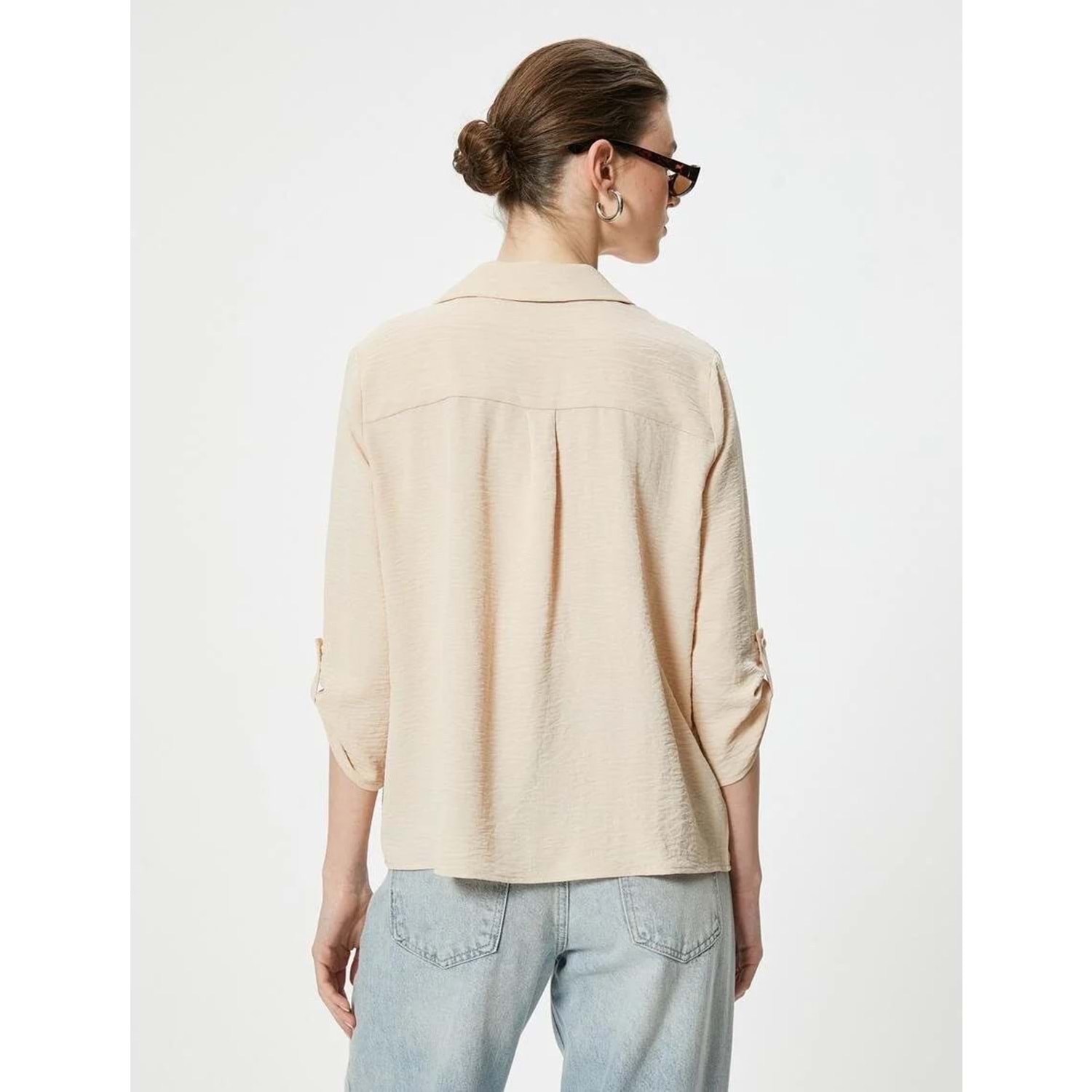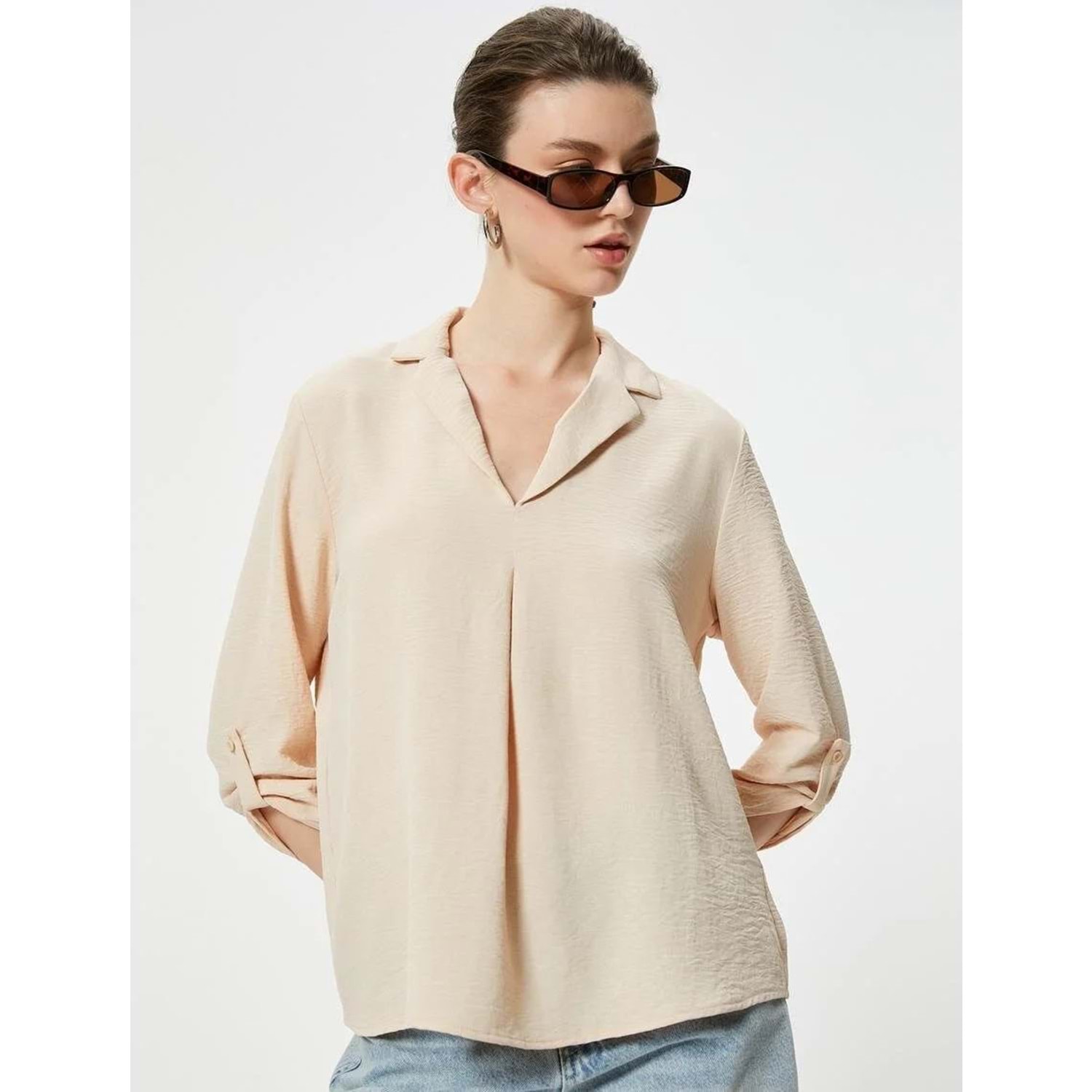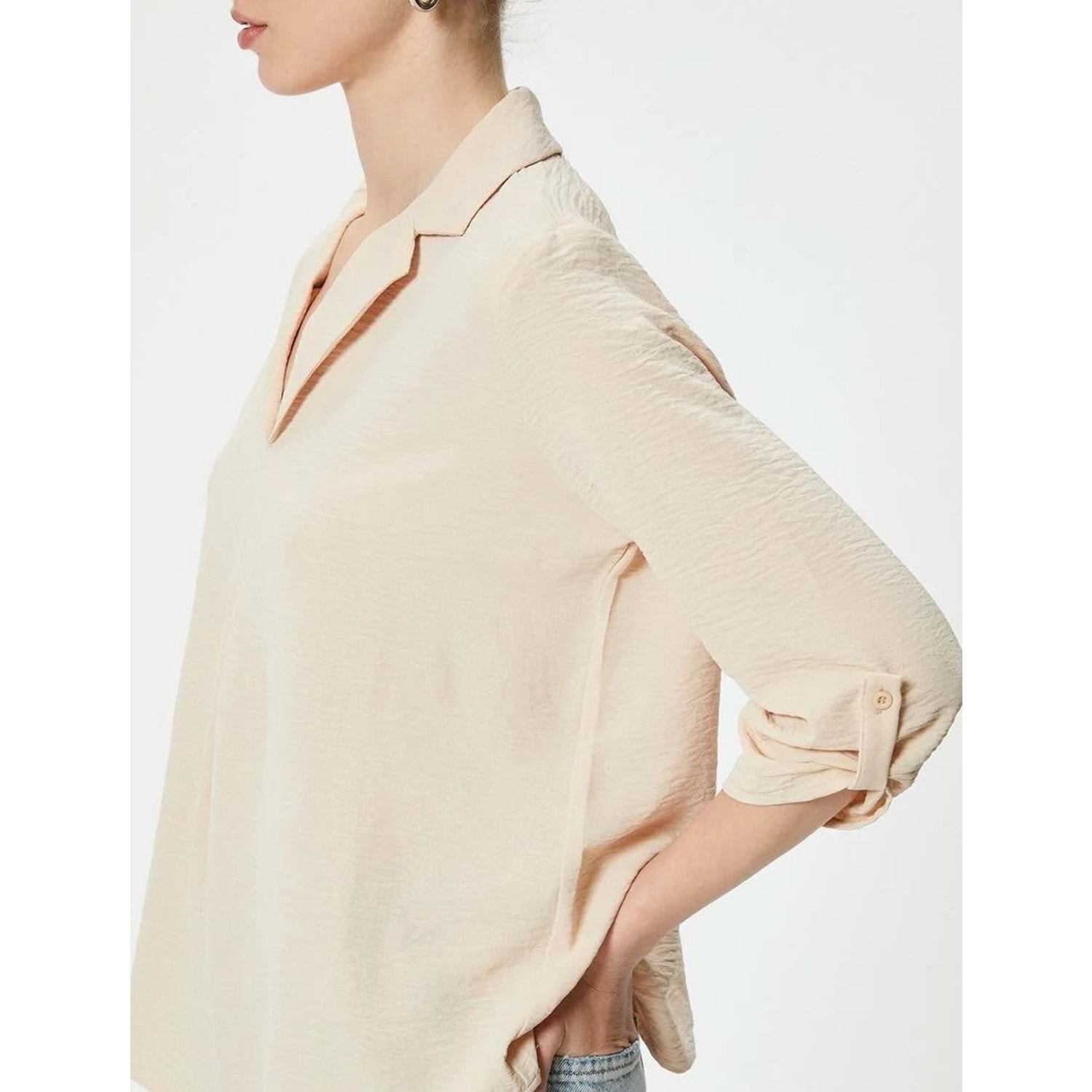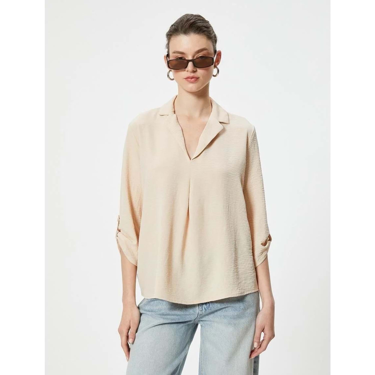 V Yaka Bluz Yarım Kollu Dokulu Standart Kesim - KOTON - 4SAK60016PW - BEJ - 44