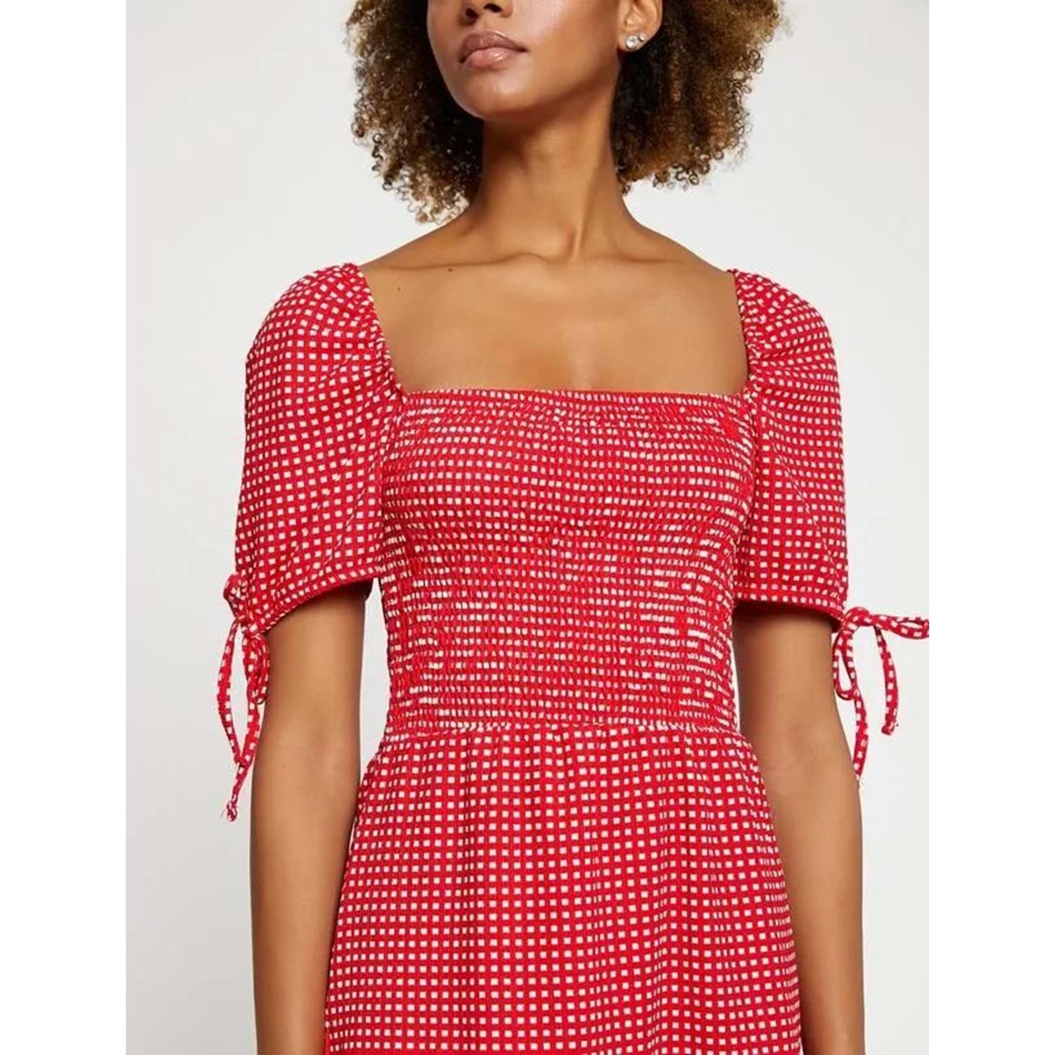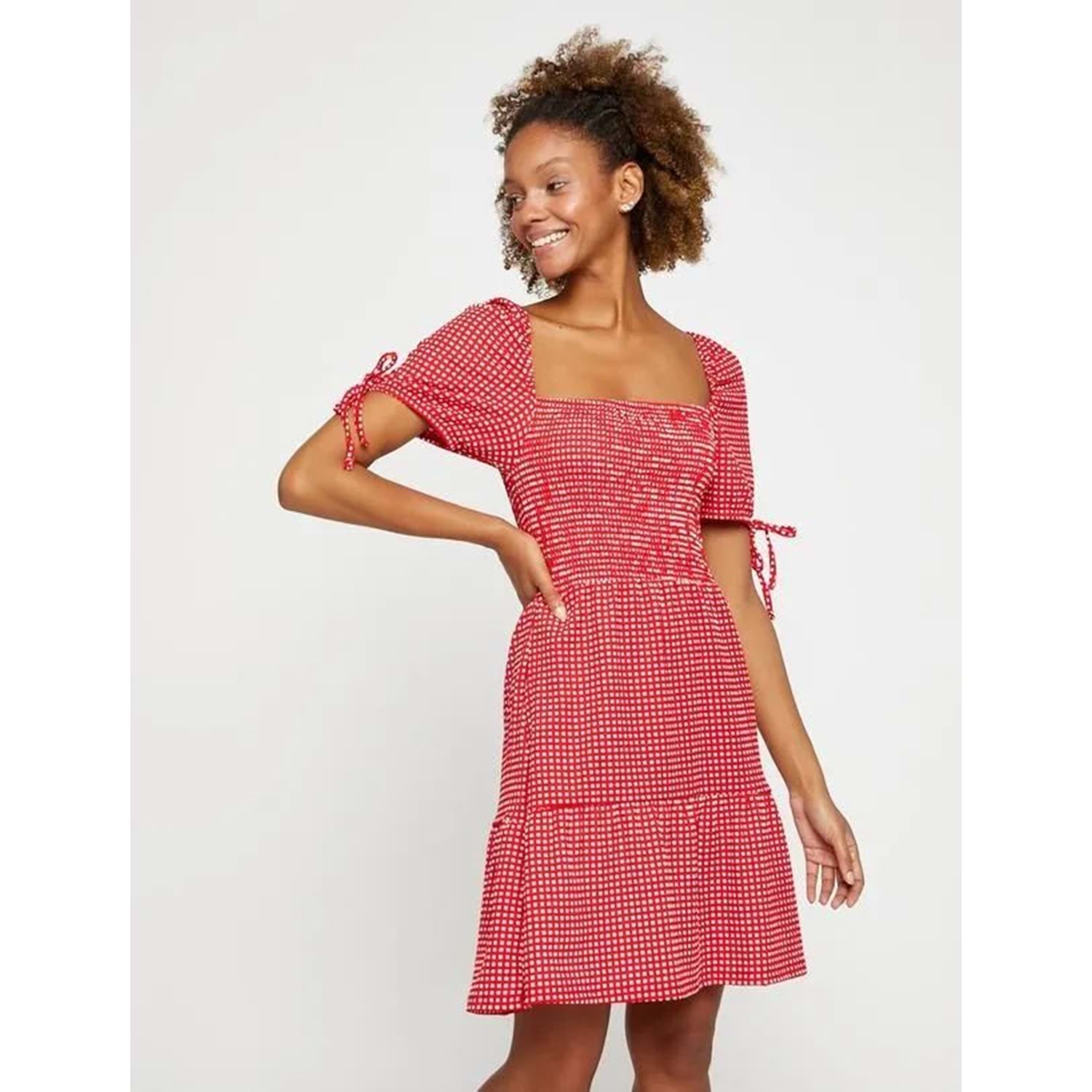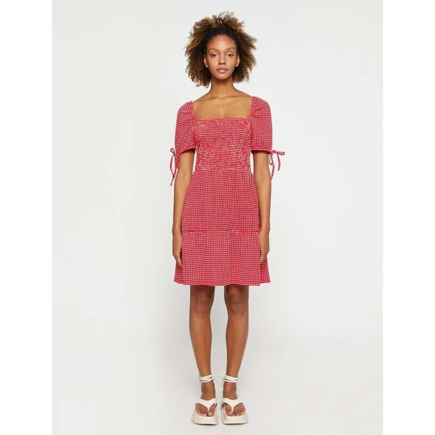 Kadın Giyim Kareli Elbise Kare Yaka Gipeli Balon Kollu 3SAL80002IK Kırmızı Desenli
