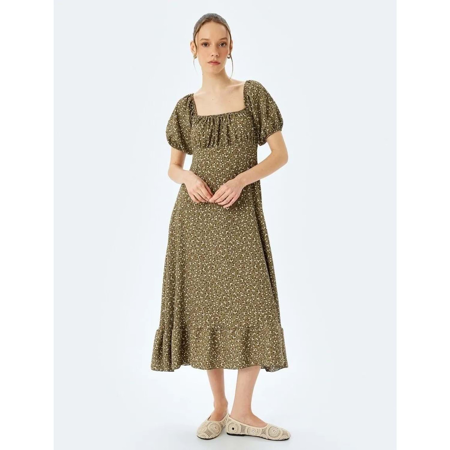 Volanlı Balon Kol Kare Yaka Çiçekli Midi Elbise 5SAL80071IK - KOTON - HAKİ DESENLİ - S
