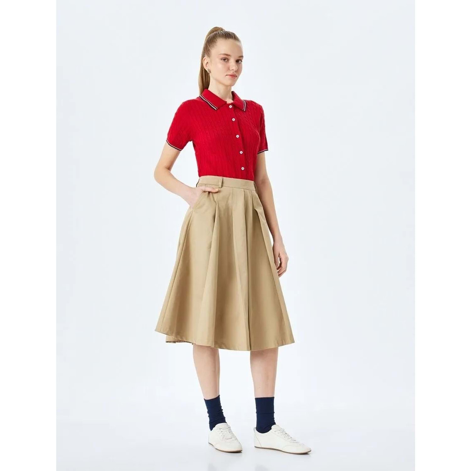 Cep detaylı, uzun pileli etek, sade tasarımı ve pileli yapısıyla rahat bir stil sunuyor. Normal bel yüksekliği, klasik A kesim formu ve cepli tasarımı ile zarif bir görünüm yaratıyor. Günlük giyimde ve özel günlerde rahatça tercih edilecek şekilde tasarlanan etek, şık ve konforlu bir kullanım sunuyor. Üst bölümdeki pililer ve geniş etek ucu hareket özgürlüğü sağlarken, şıklığınızı da tamamlıyor.