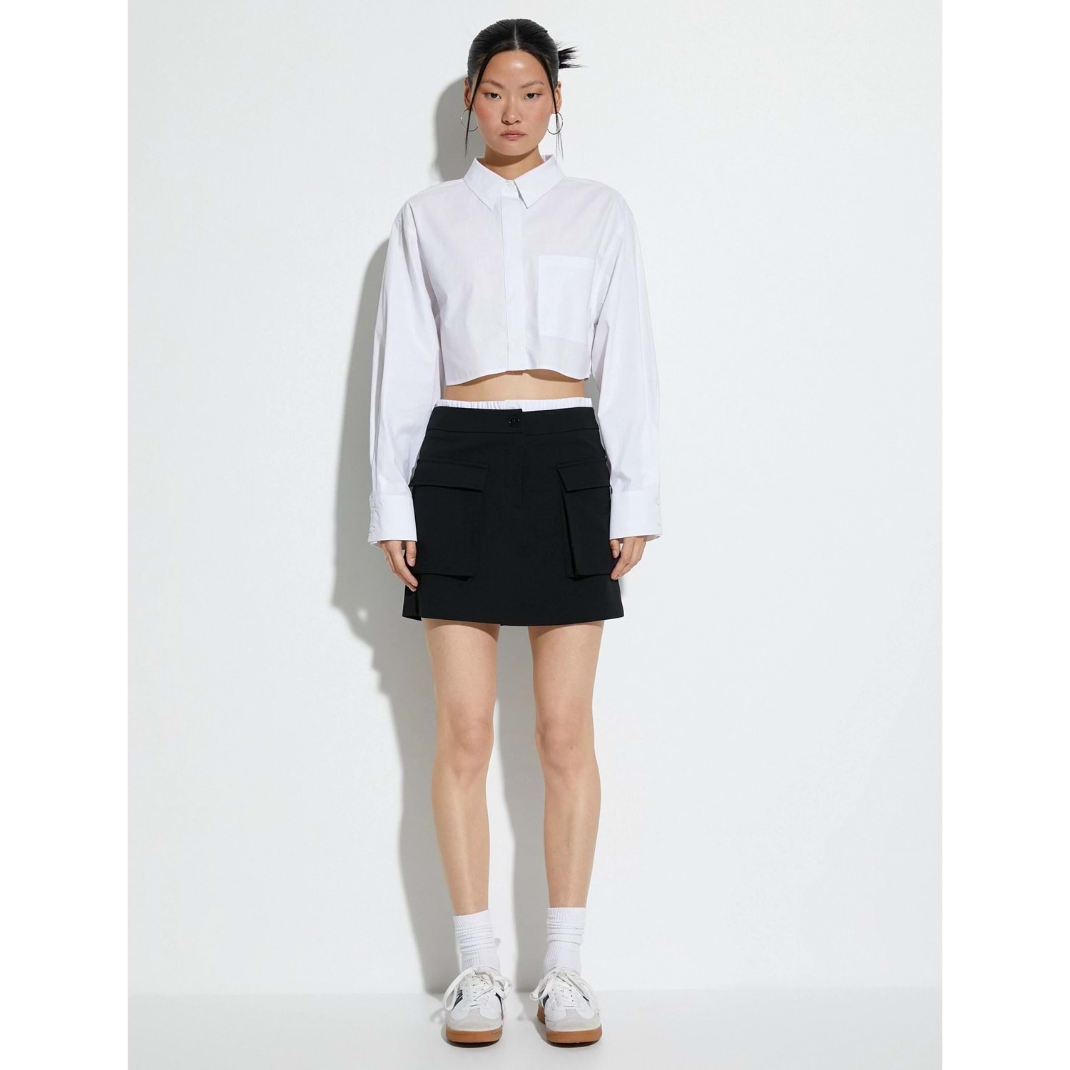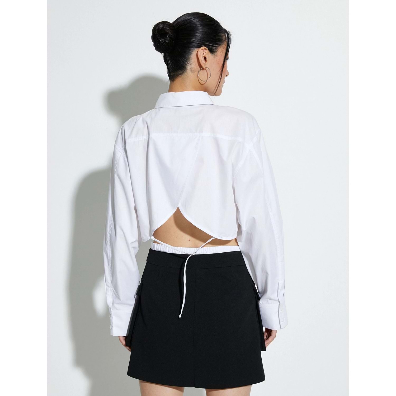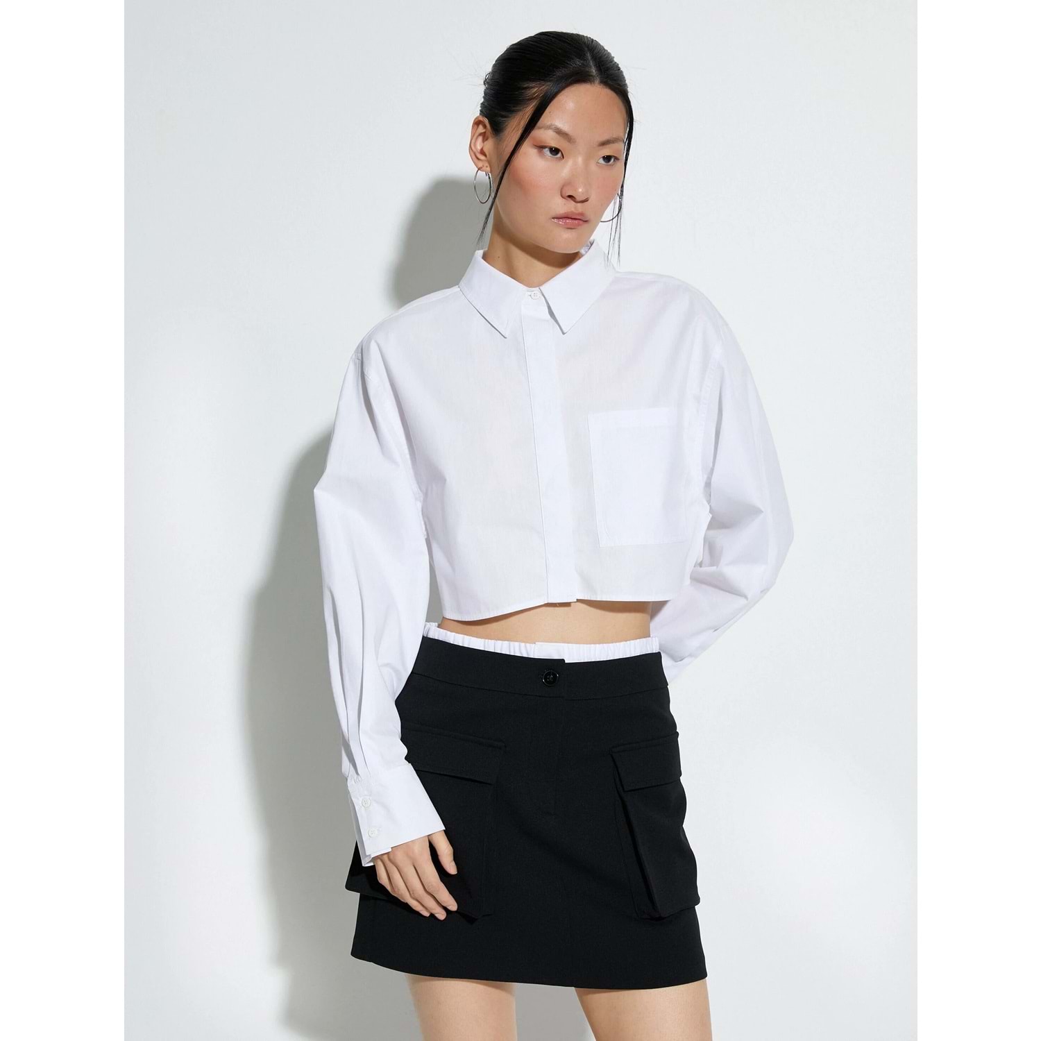 Crop Poplin Gömlek Uzun Kollu Rahat Kesim Düğmeli Cep Detaylı - KOTON - 4SAK60250PW - BEYAZ - 42