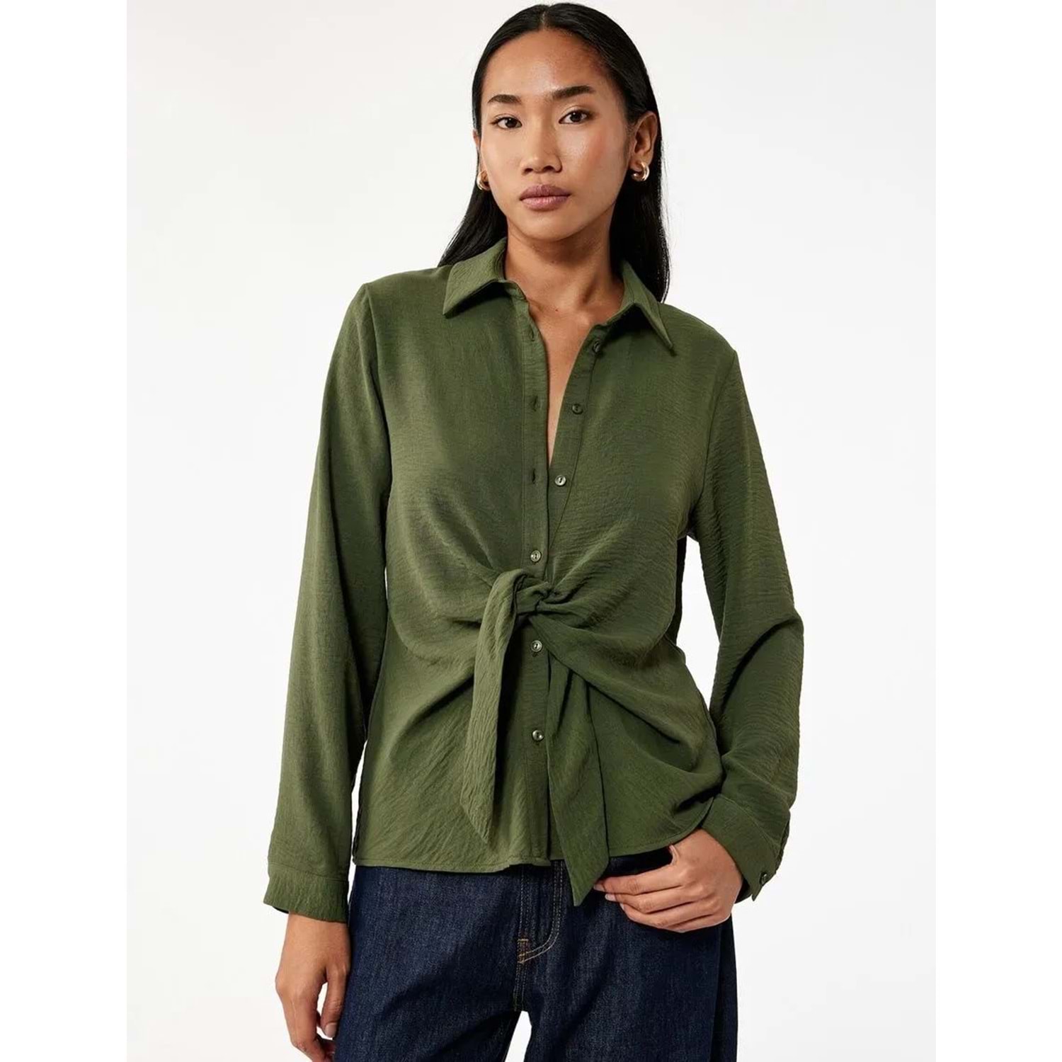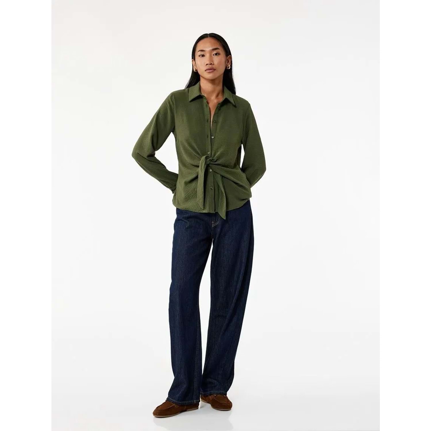 Kadın Giyim Aerobin Kumaş Önden Bağlama Detaylı Klasik Yaka Uzun Kollu Gömlek - KOTON - 6WAK60099PW - HAKİ - 34