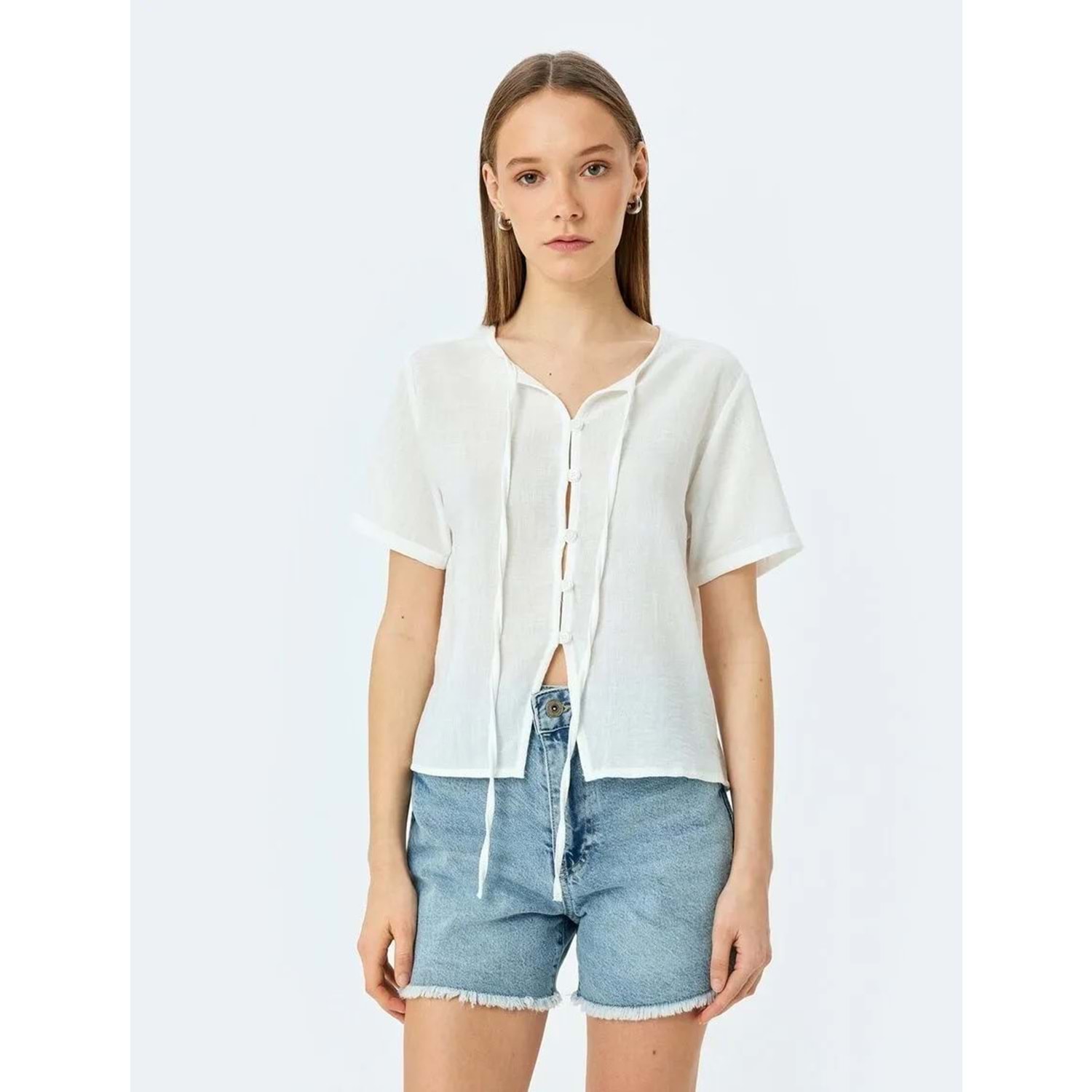 V Yaka Kısa Kollu Düğmeli Bağcıklı Yaka Gömlek 5SAL60063IW - KOTON - EKRU - 34