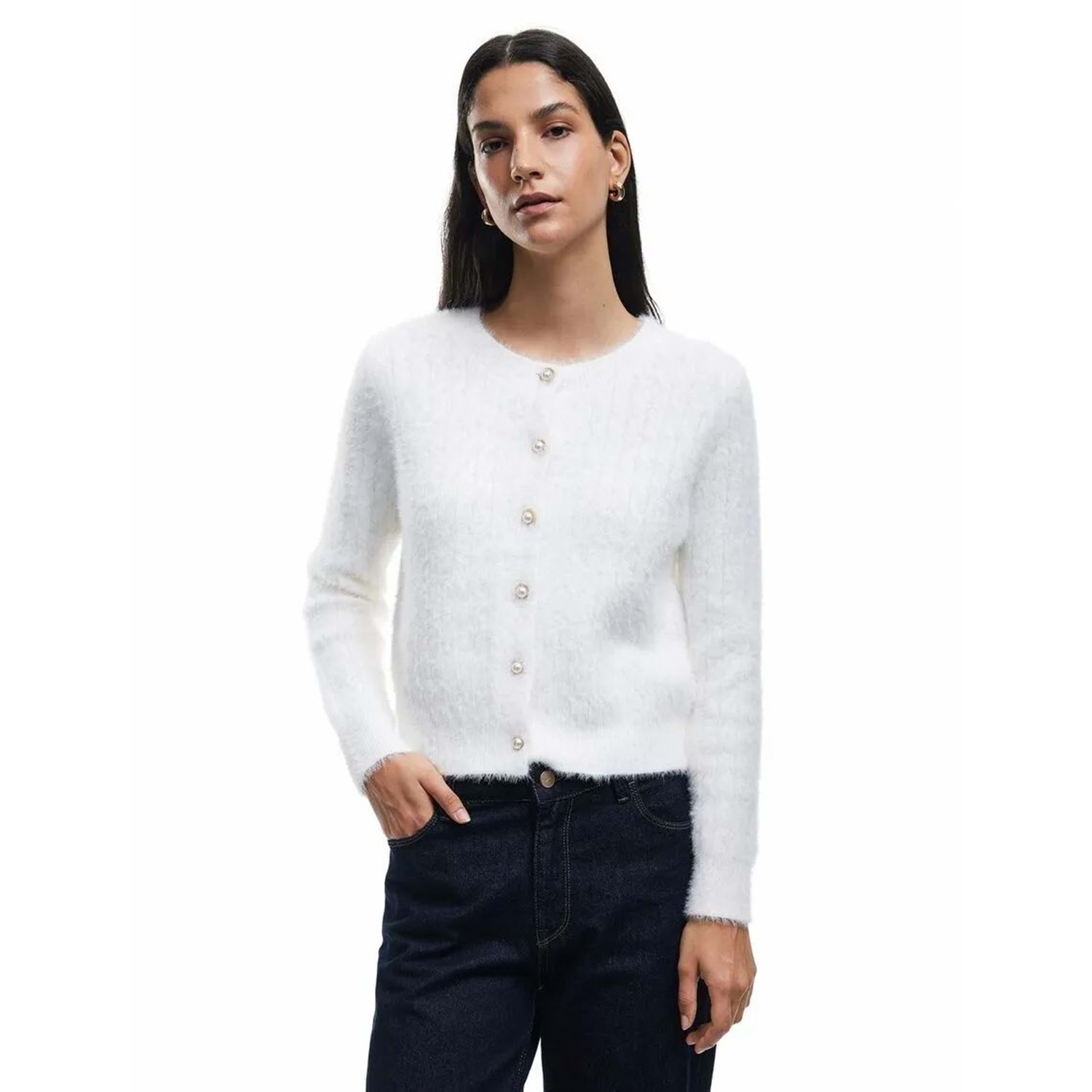 Kadın Giyim Düğmeli Uzun Kollu Viskon Karışımlı Örgü Dokulu Bisiklet Yaka Hırka - KOTON - 6WAL90026HT - EKRU - M