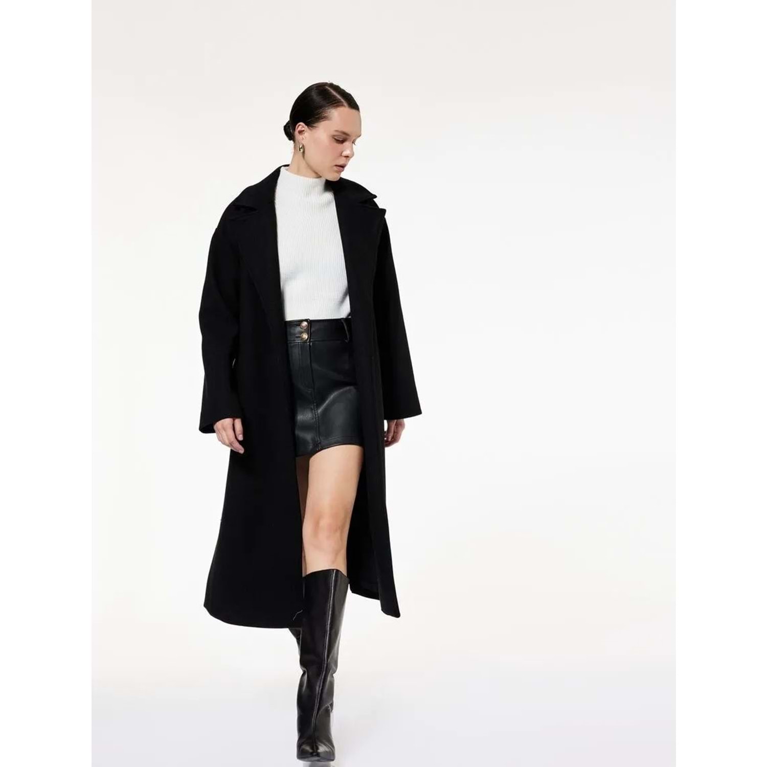 Kadın Giyim Uzun Kollu Kruvaze Kemerli Uzun Kaşe Kaban - KOTON - 6WAK00115EW - SİYAH - 44