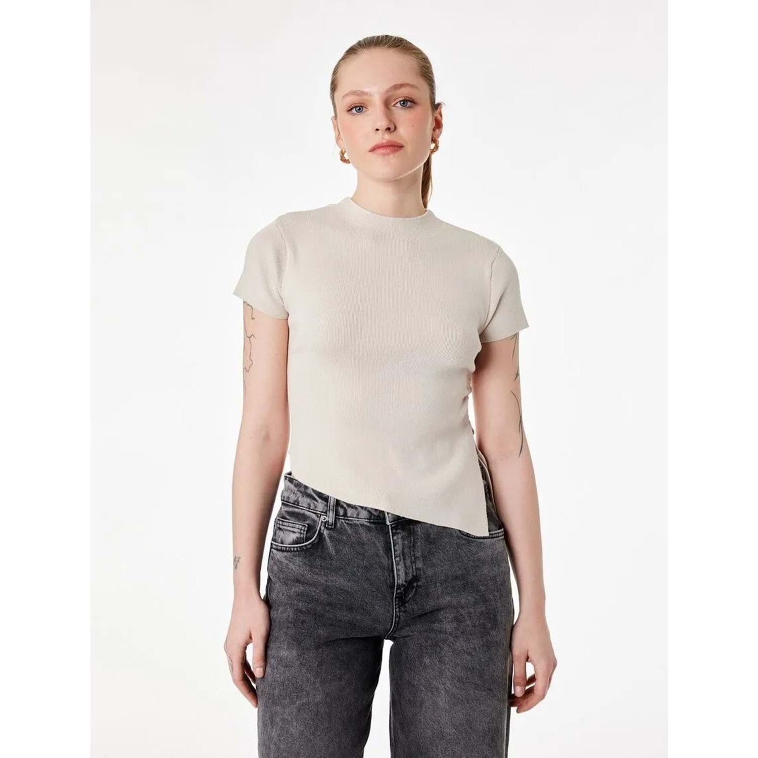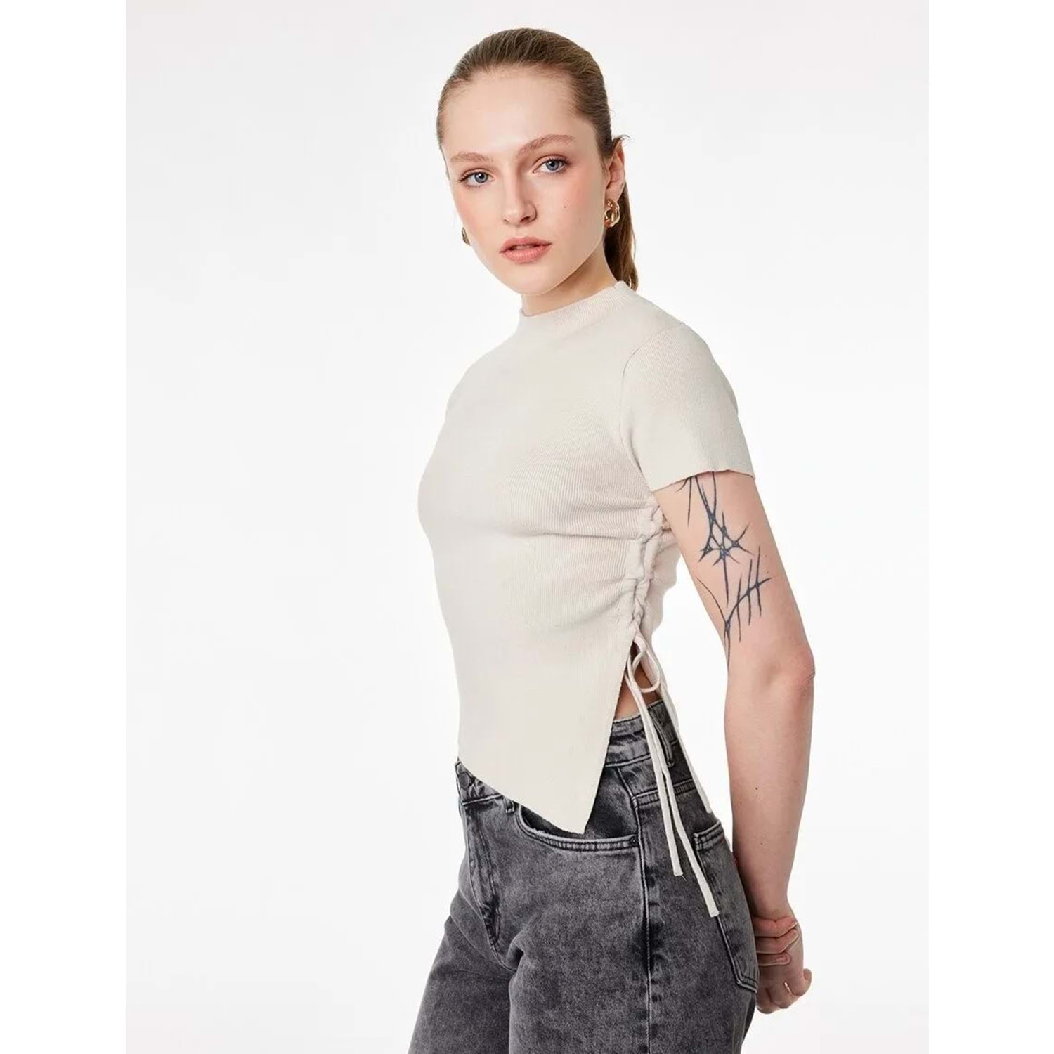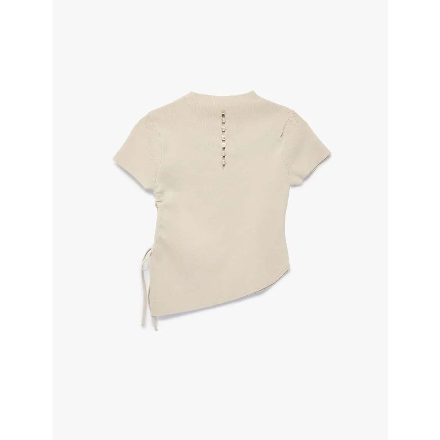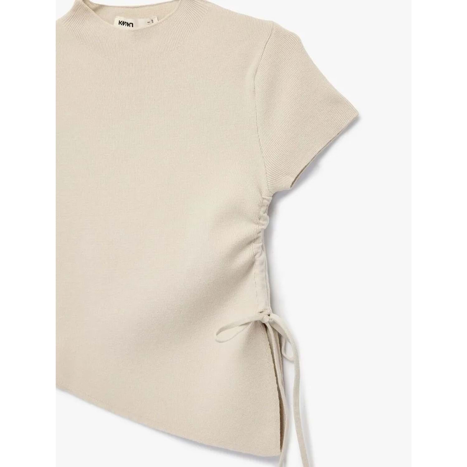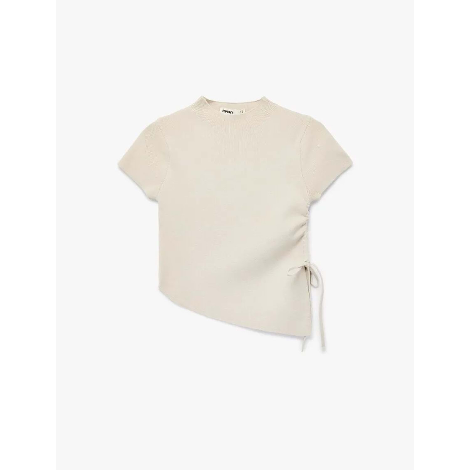 Kadın Giyim Asimetrik Kesim Kısa Kollu Bisiklet Yaka Büzgülü Triko Tişört - KOTON - 6WAK90617HT - BEJ - L