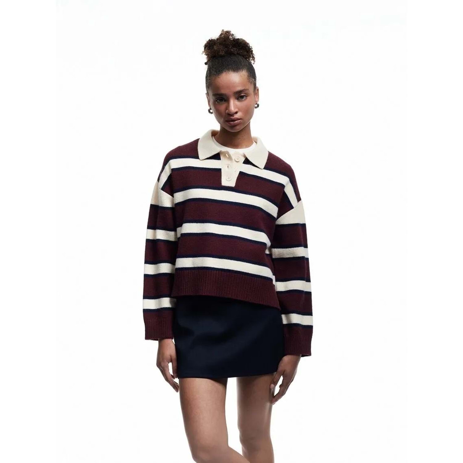 Kadın Giyim Polo Yaka Çizgili Triko Kazak - KOTON - 6WAL90014HT - BORDO - M