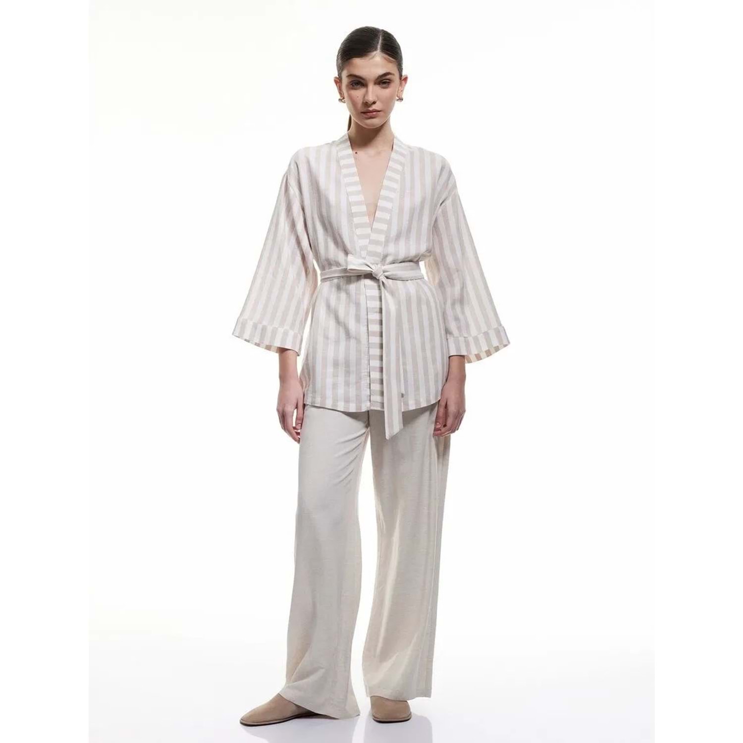 Beli Kuşak Detaylı Kruvaze Viskon Keten Kimono Ceket - KOTON - BEJ ÇİZGİLİ - 42
