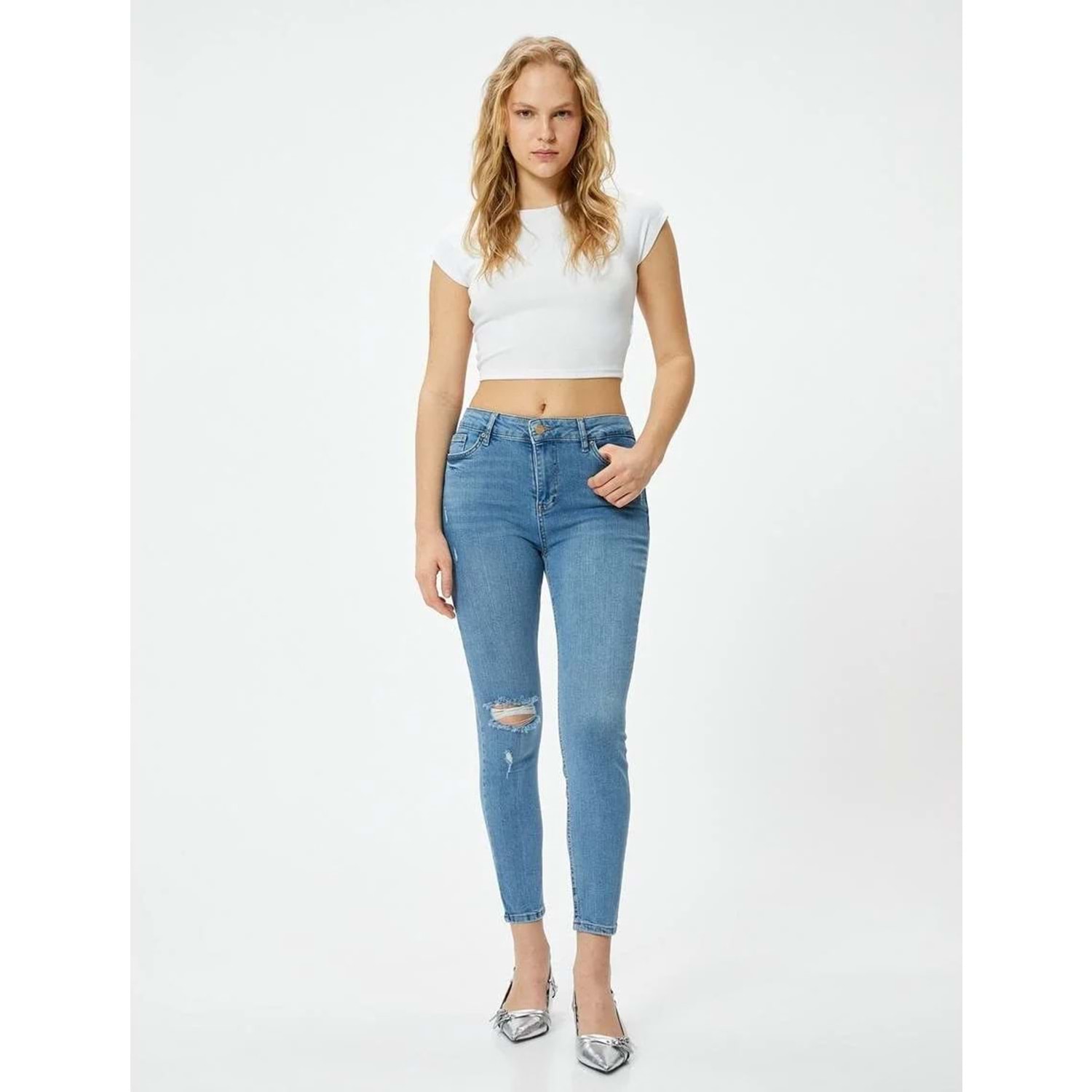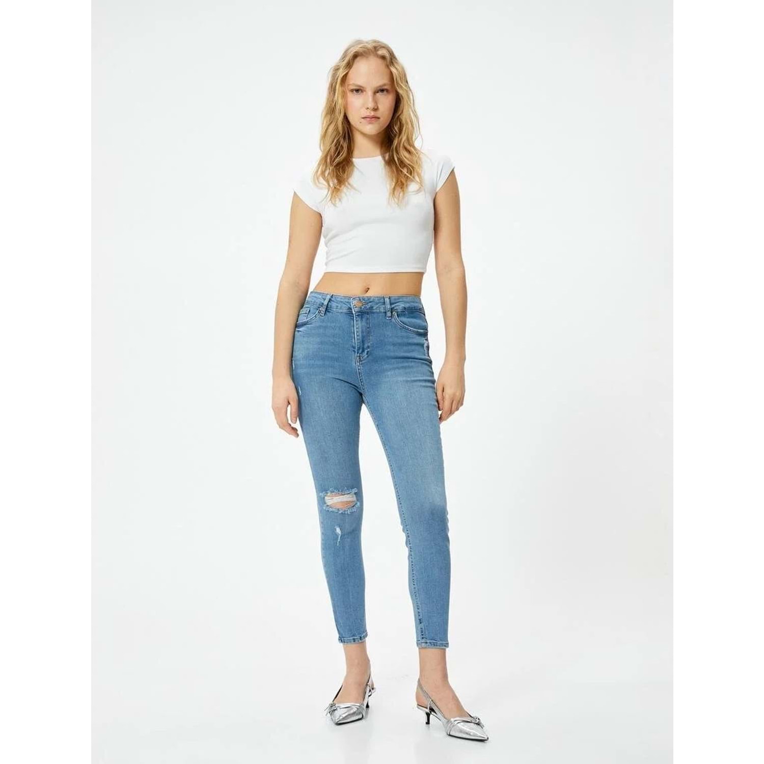 Dar Kesim Yüksek Bel Kot Pantolon Yıpratmalı Esnek Cepli Pamuklu - Carmen Skinny Jeans - KOTON - 4SAL40060MD - AÇIK İNDİGO - 30/32