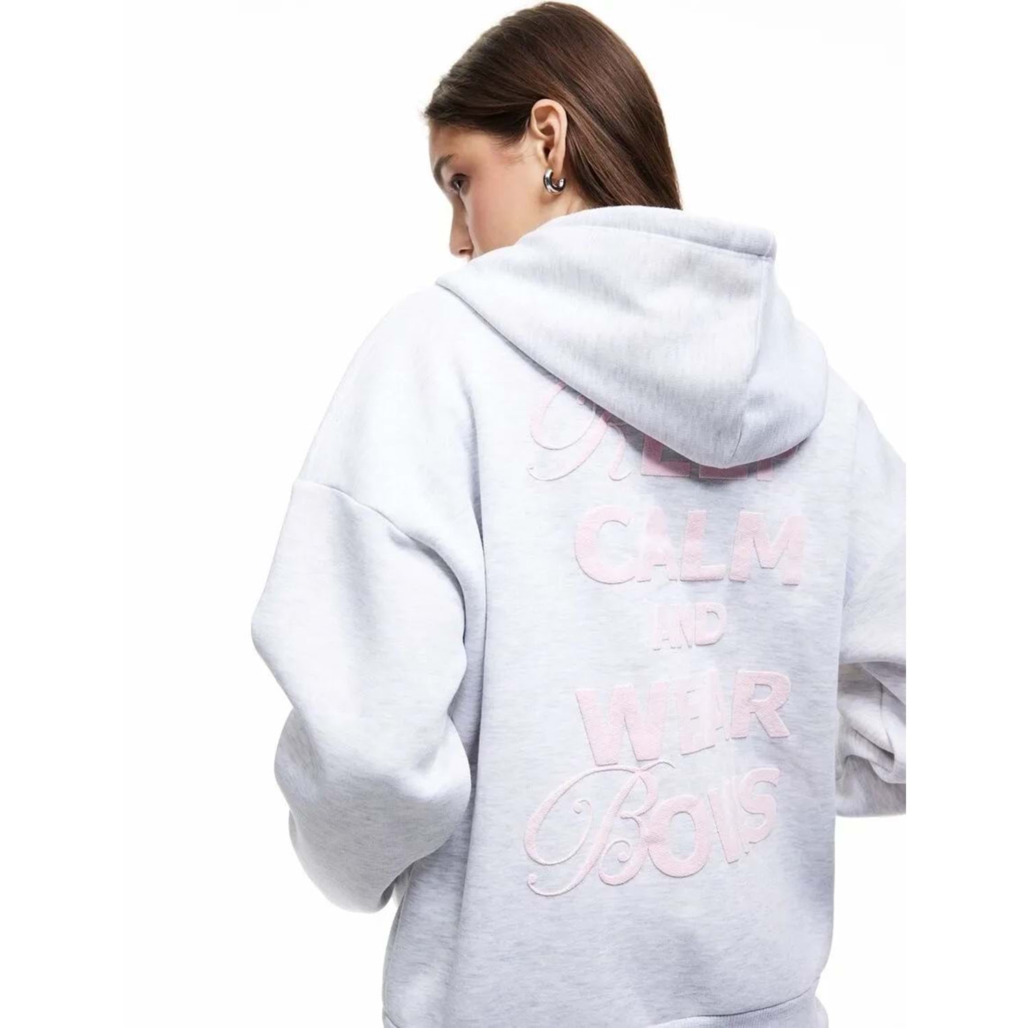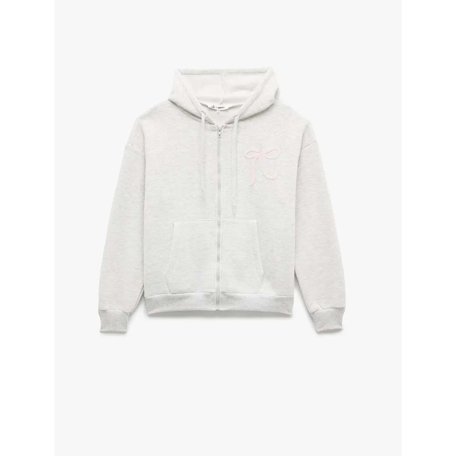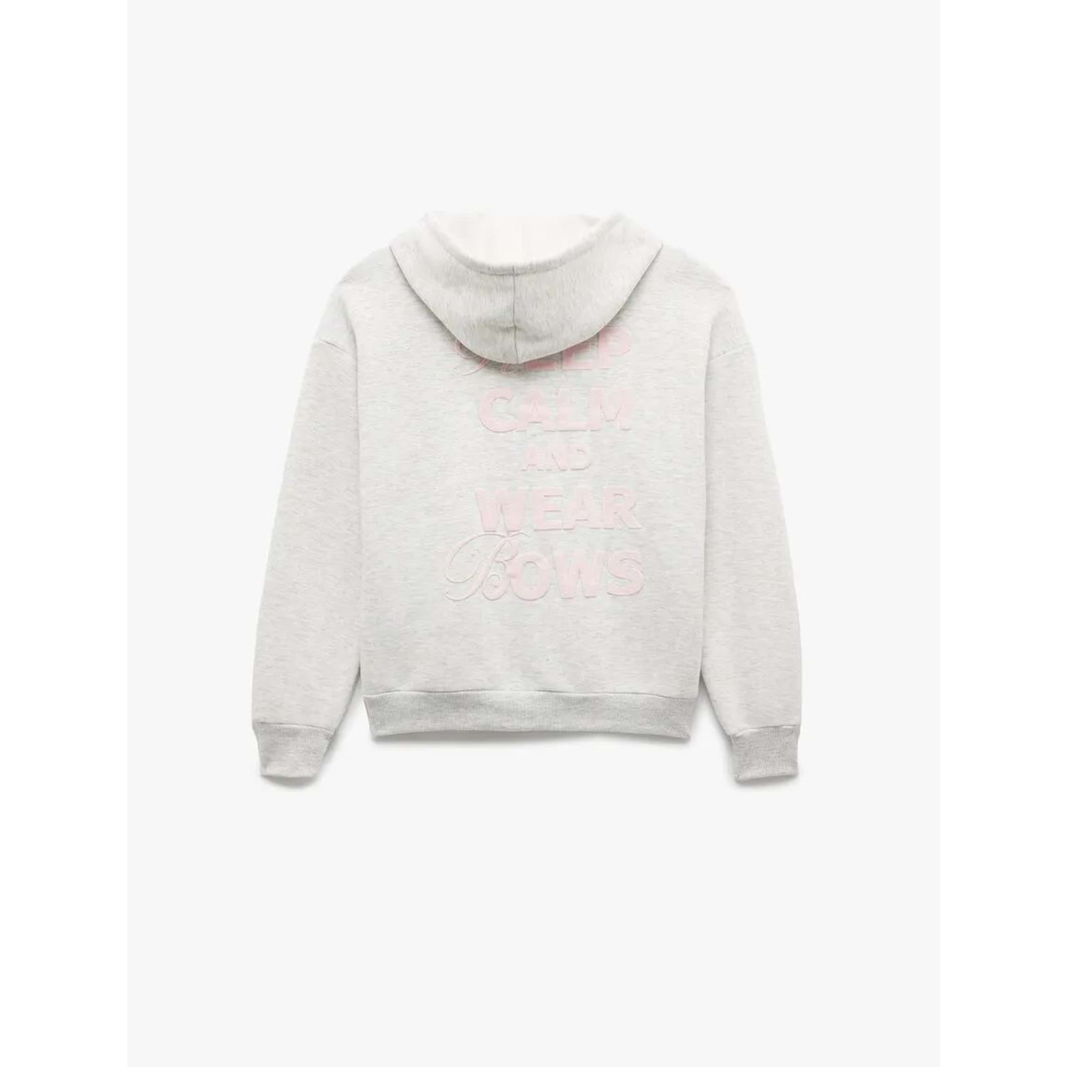 Kadın Giyim Şardonlu Kanguru Cepli Kapüşonlu Fiyonklu Arkası Baskılı Fermuarlı Oversize Sweatshirt - KOTON - 6WAL10228IK - KAR MELANJ - M-L
