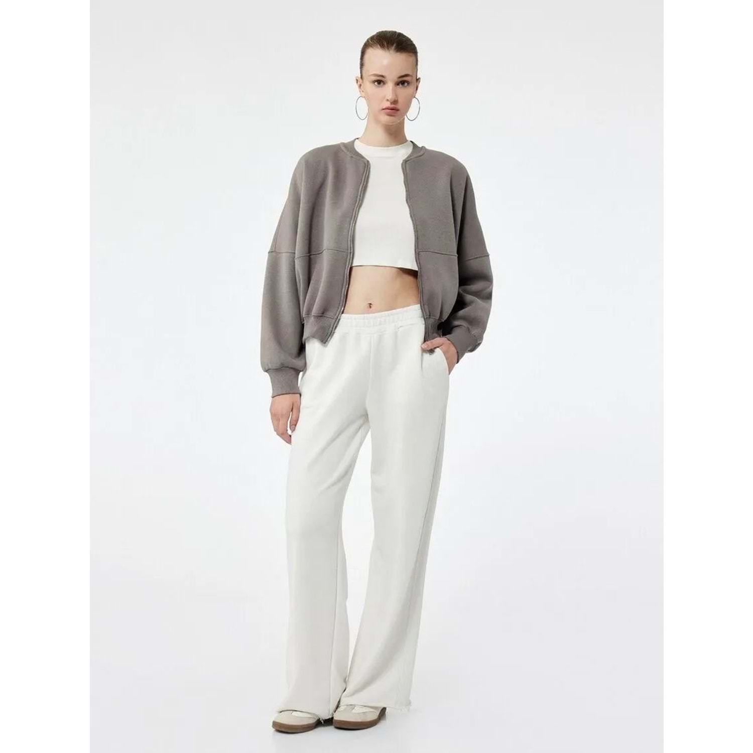 Kadın Giyim Üç İplik Şardonlu Uzun Kollu Fermuarlı Bomber Yaka Sweatshirt - KOTON - 6WAL10126IK - GRİ - S