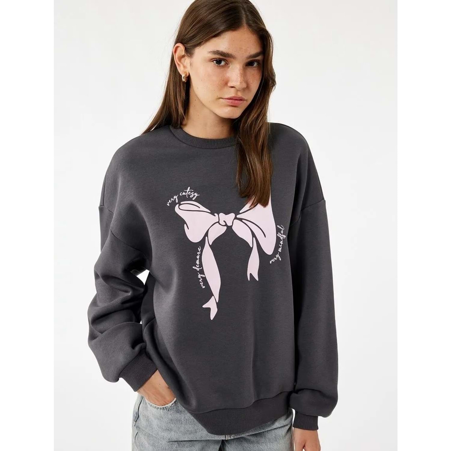 Kadın Giyim Uzun Kollu Bisiklet Yaka Şardonlu Fiyonk Baskılı Sweatshirt - KOTON - 6WAL10168IK - ANTRASİT - S