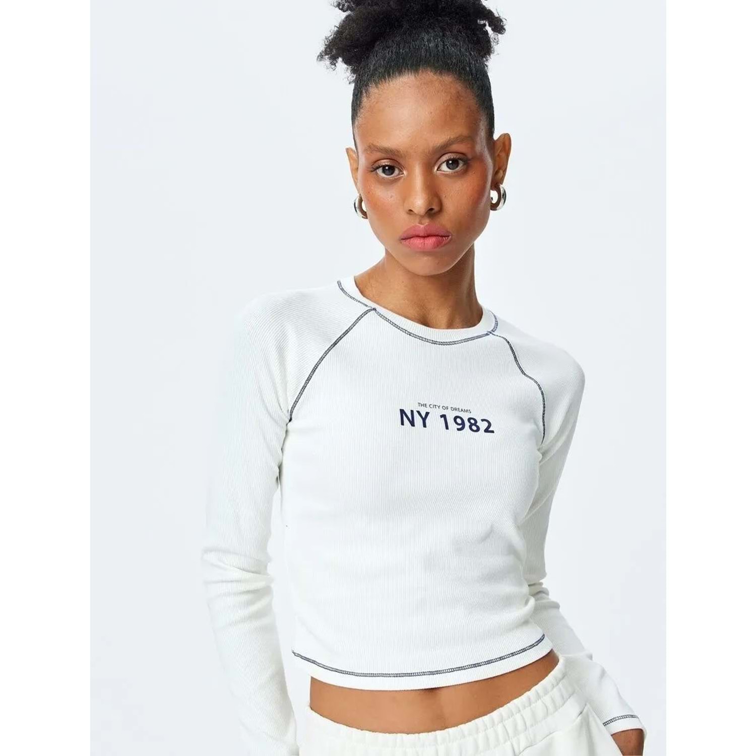 Bisiklet Yaka Uzun Kollu Slogan Baskılı Tişört 5SAK50263EK - KOTON - KIRIK BEYAZ - M