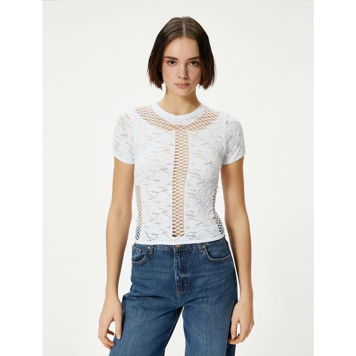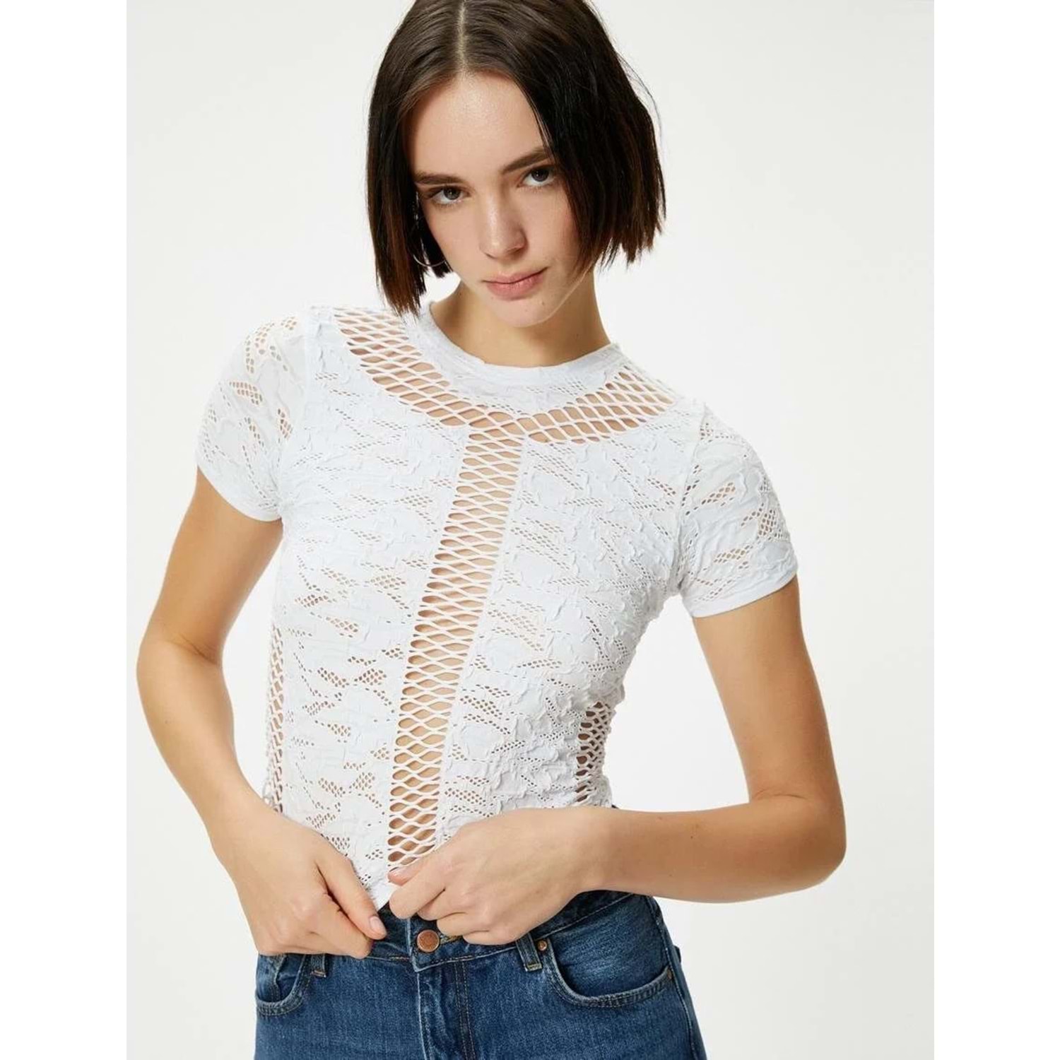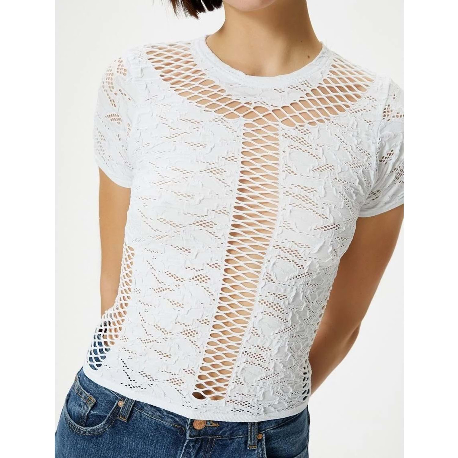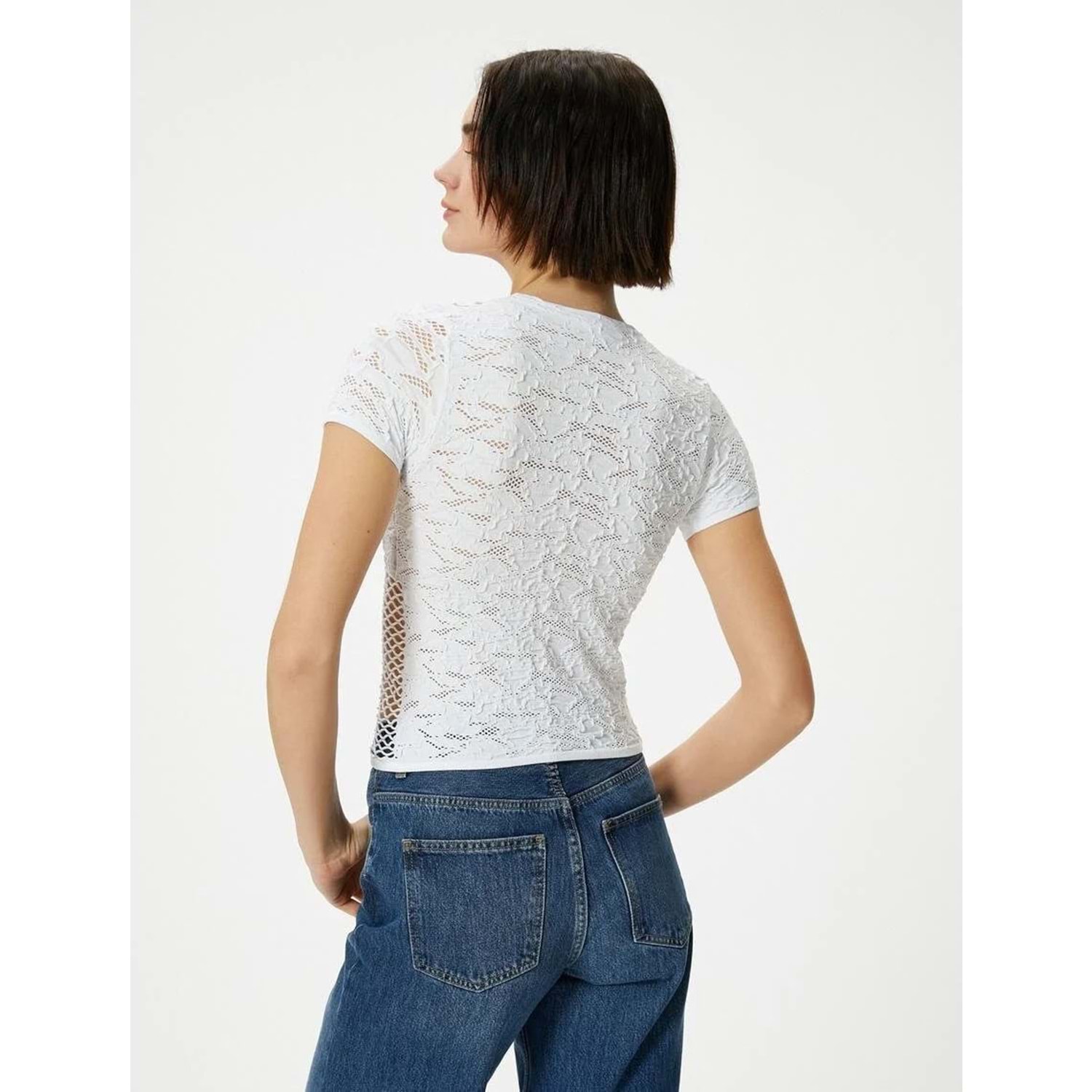 File Detaylı Crop Tişört Dokulu Kısa Kollu Bisiklet Yaka - KOTON - 4SAL10514IK - EKRU - XS-S