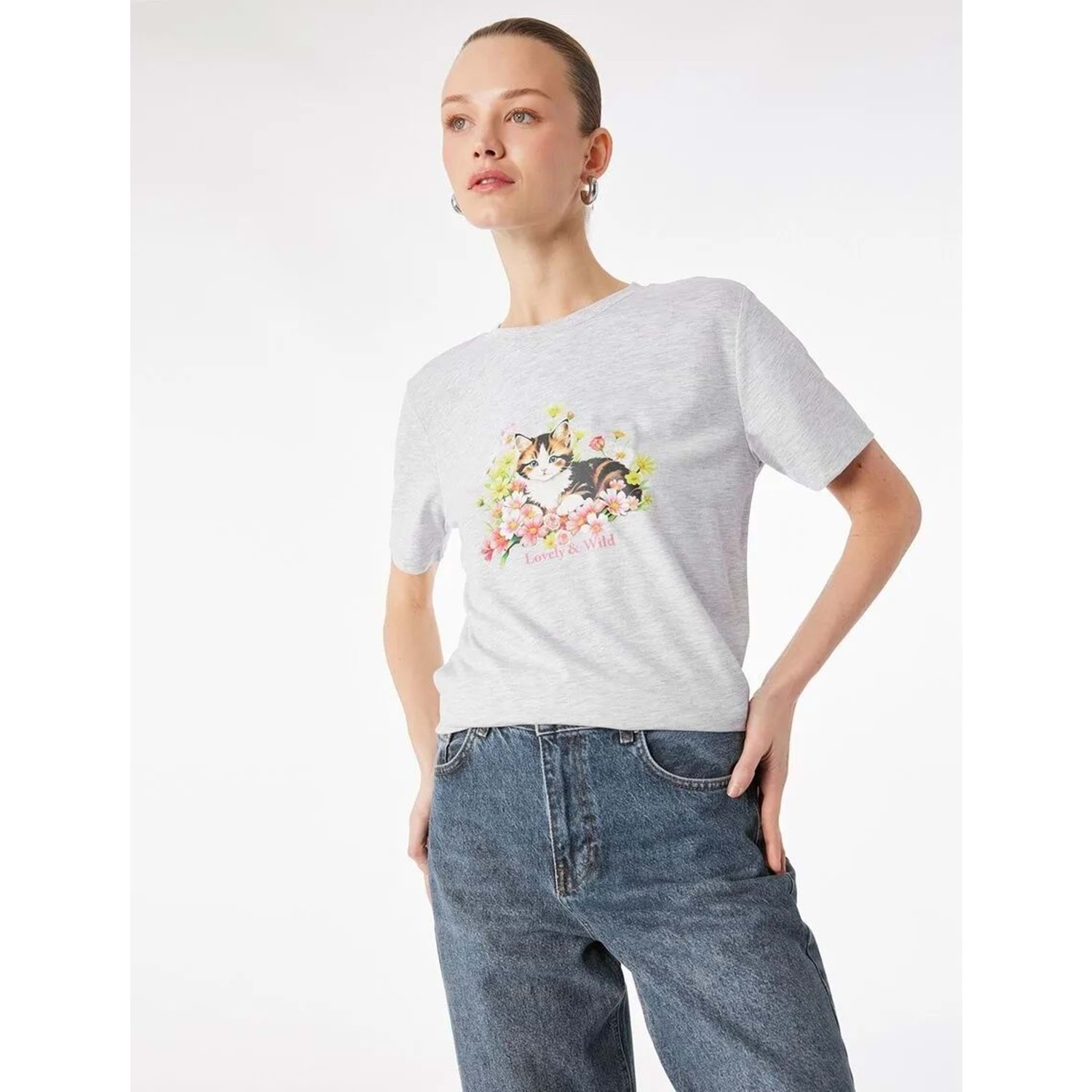 Kadın Giyim Kısa Kollu Bisiklet Yaka Kedi Baskılı Tişört - KOTON - 6SAK50047EK - GRİ MELANJ - S
