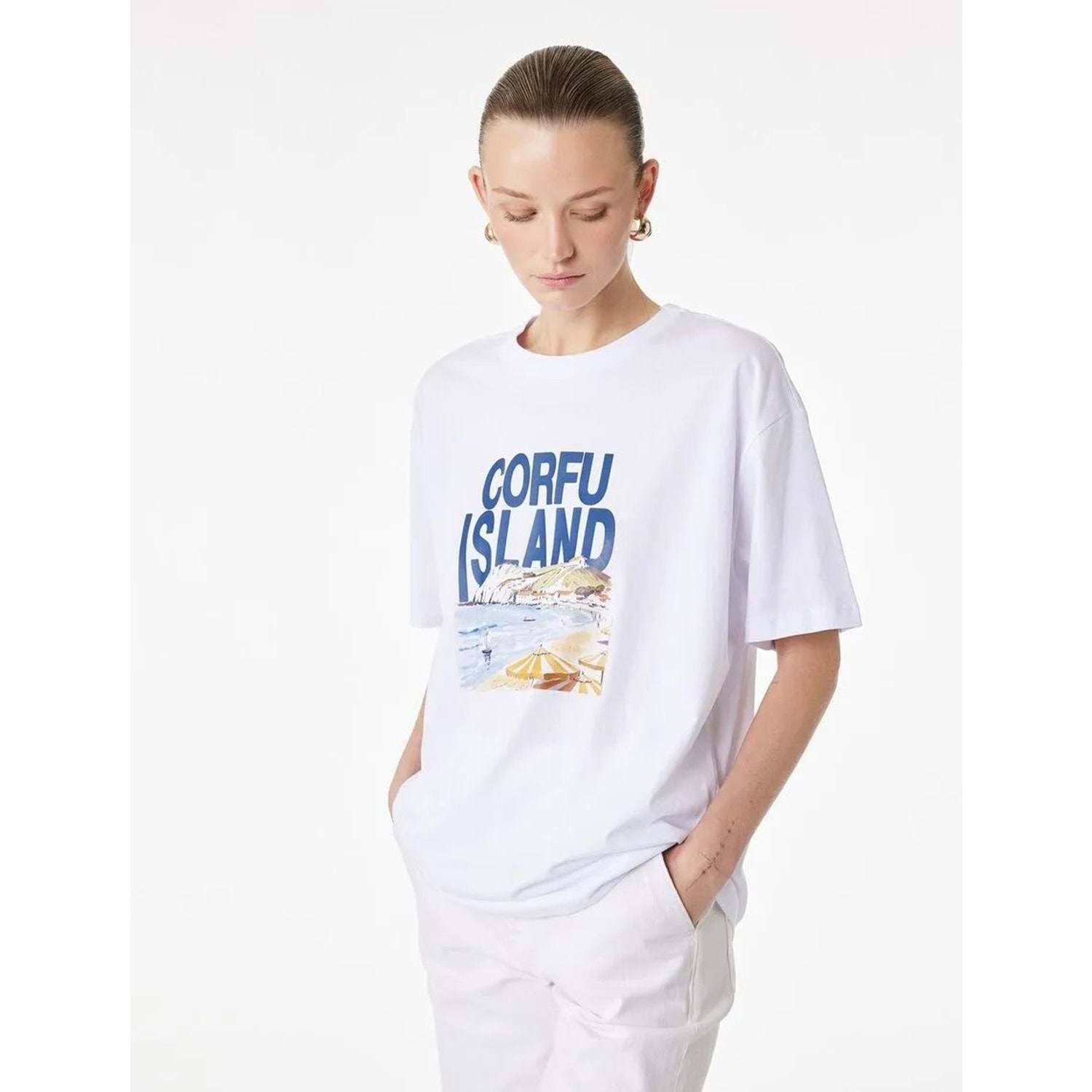 Kadın Giyim Pamuklu Kısa Kollu Baskılı Bisiklet Yaka Baskılı Tişört - KOTON - 6SAK50049EK - BEYAZ - S