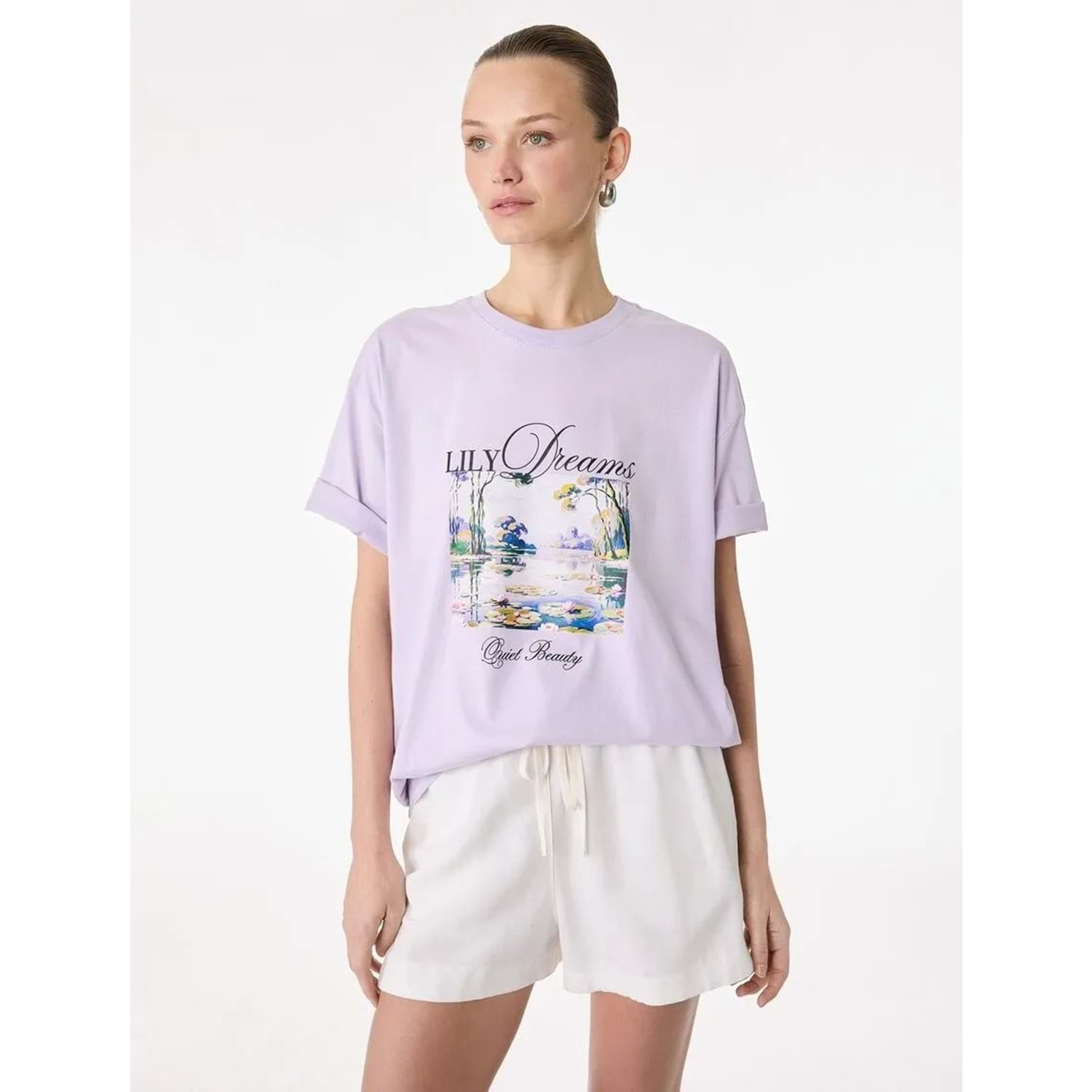 Kadın Giyim Pamuklu Kısa Kollu Bisiklet Yaka Baskılı Tişört - KOTON - 6SAK50048EK - LİLA - S