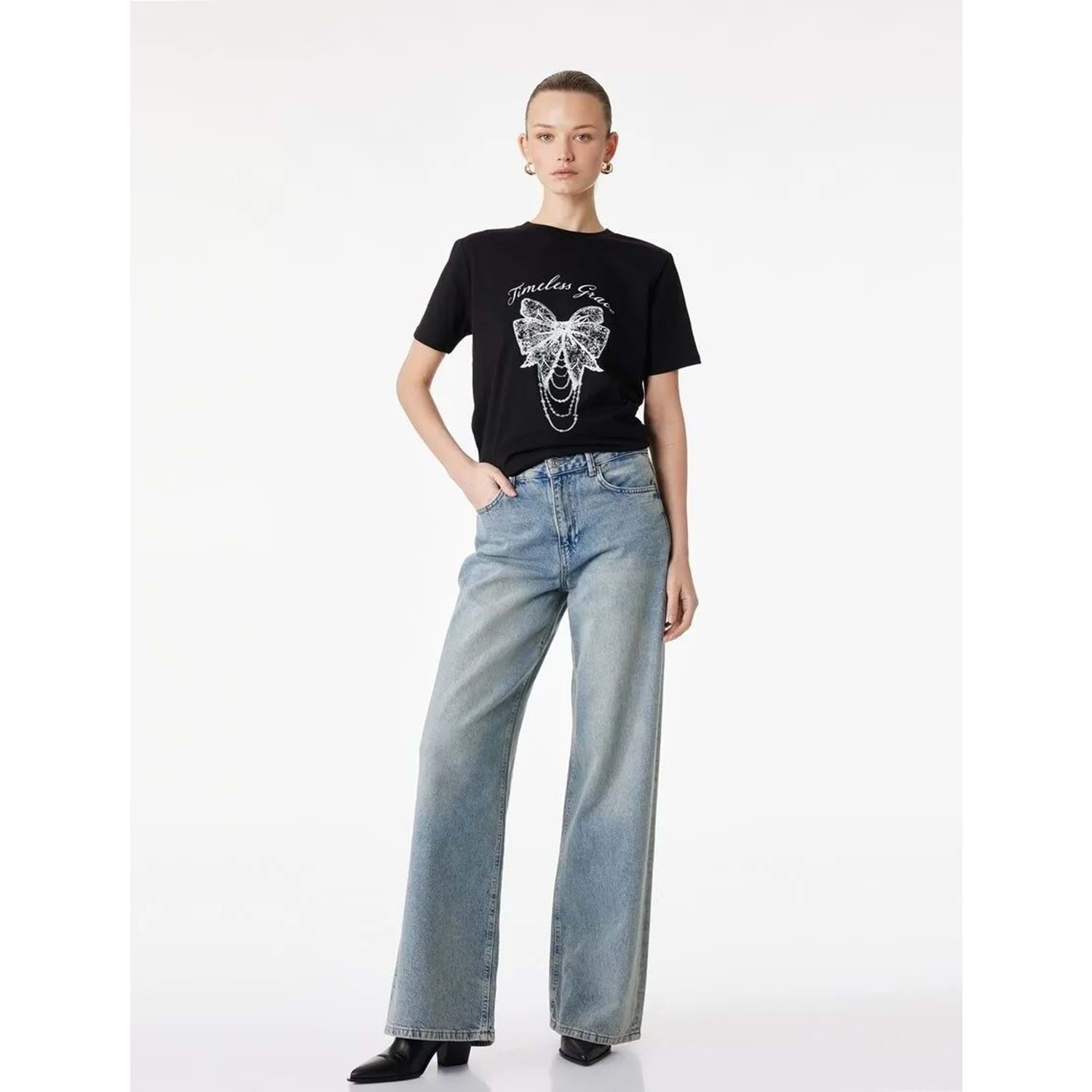 Kadın Giyim Pamuklu Kısa Kollu Bisiklet Yaka Fiyonk Baskılı Tişört - KOTON - 6SAK50029EK - SİYAH - S