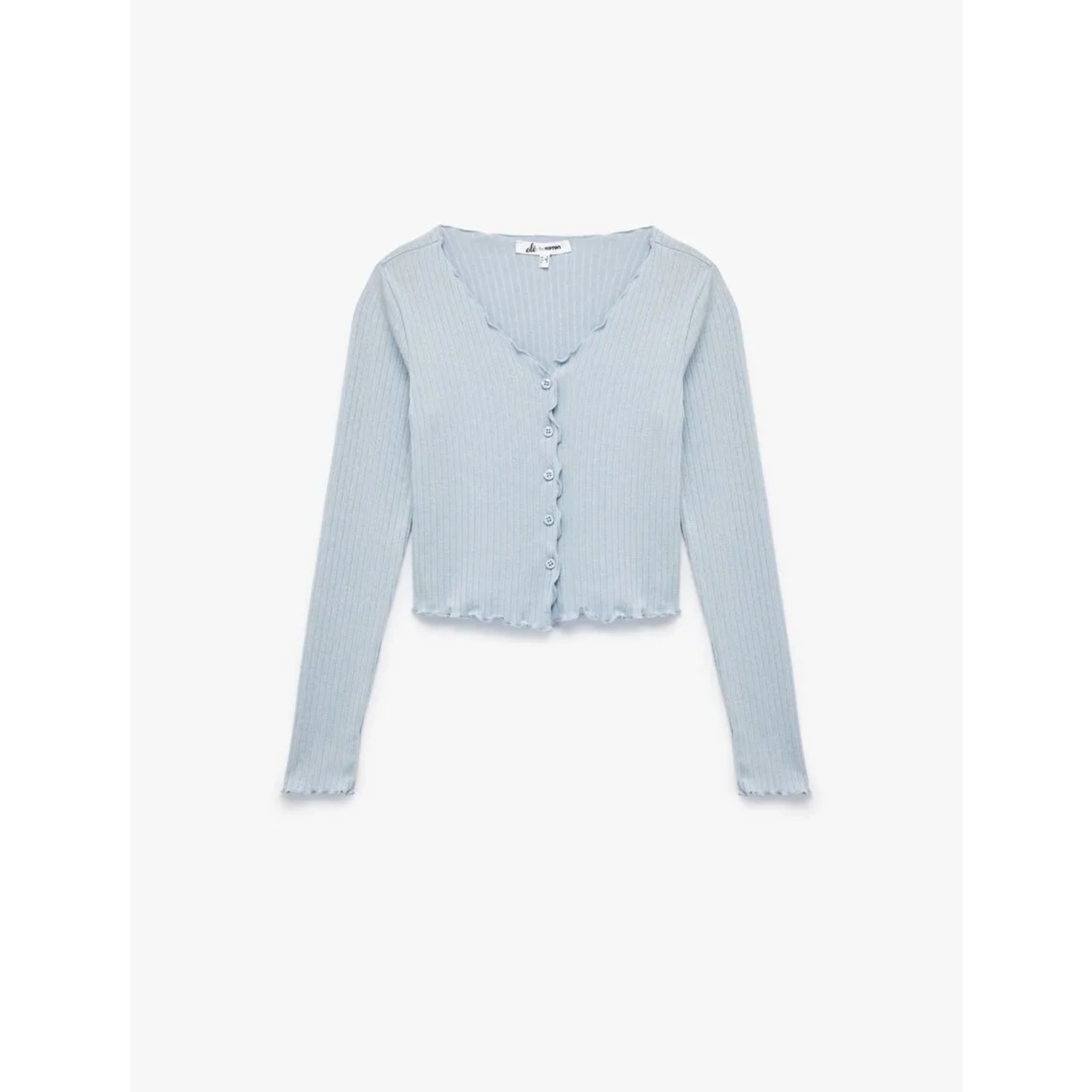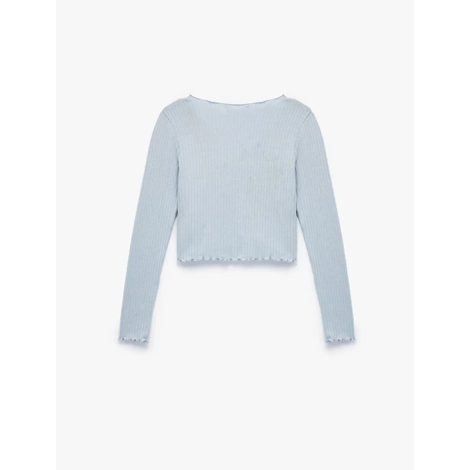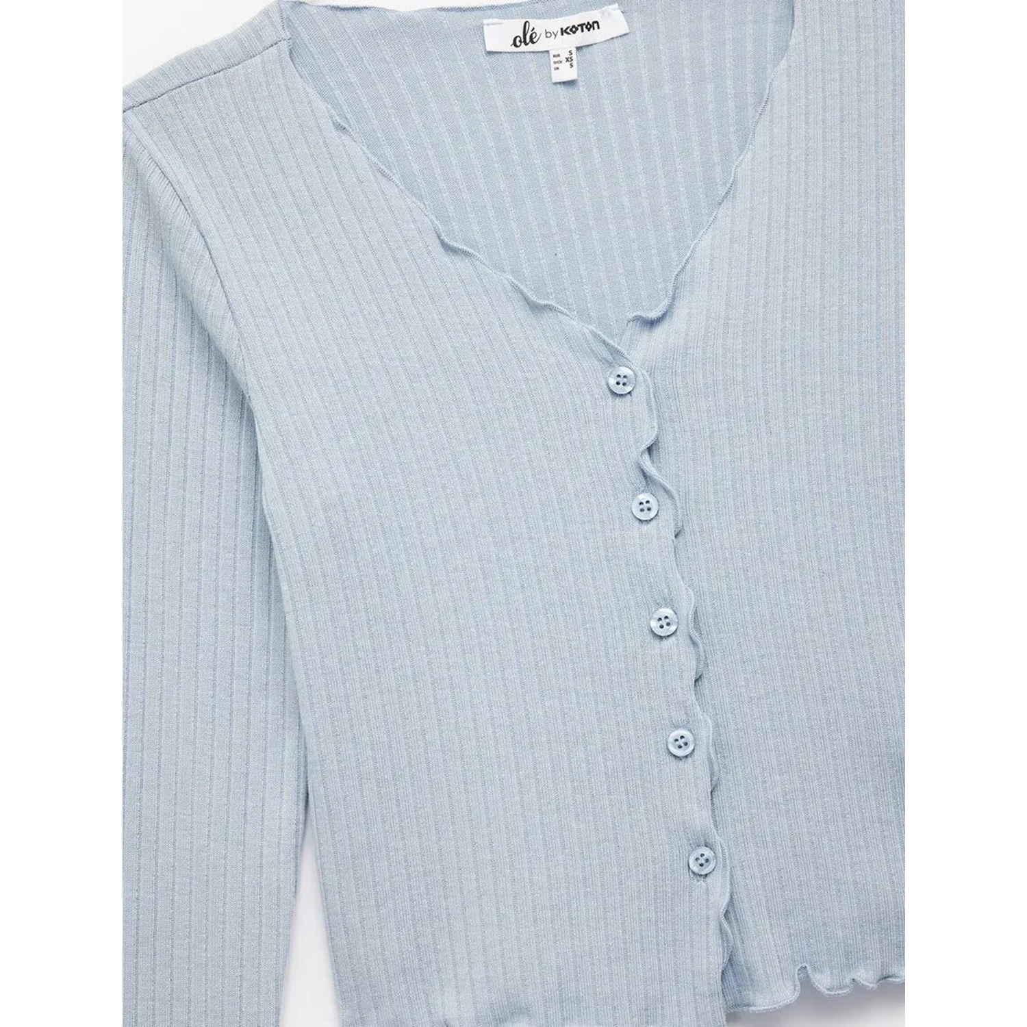 Kadın Giyim V Yaka Düğmeli Fırfırlı Kaşkorse Viskon Karışımlı Uzun Kollu Tişört - KOTON - 6WAL10425IK - MAVİ - XS