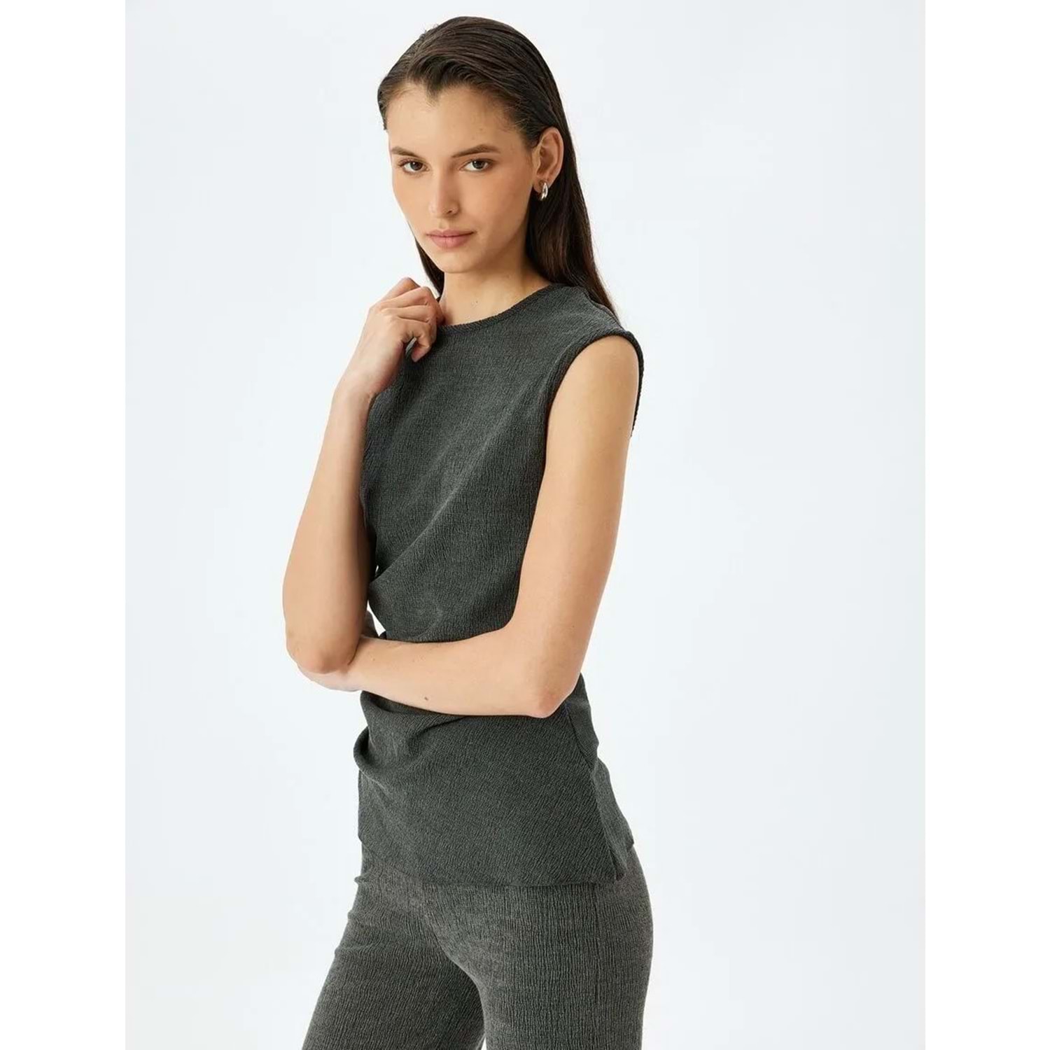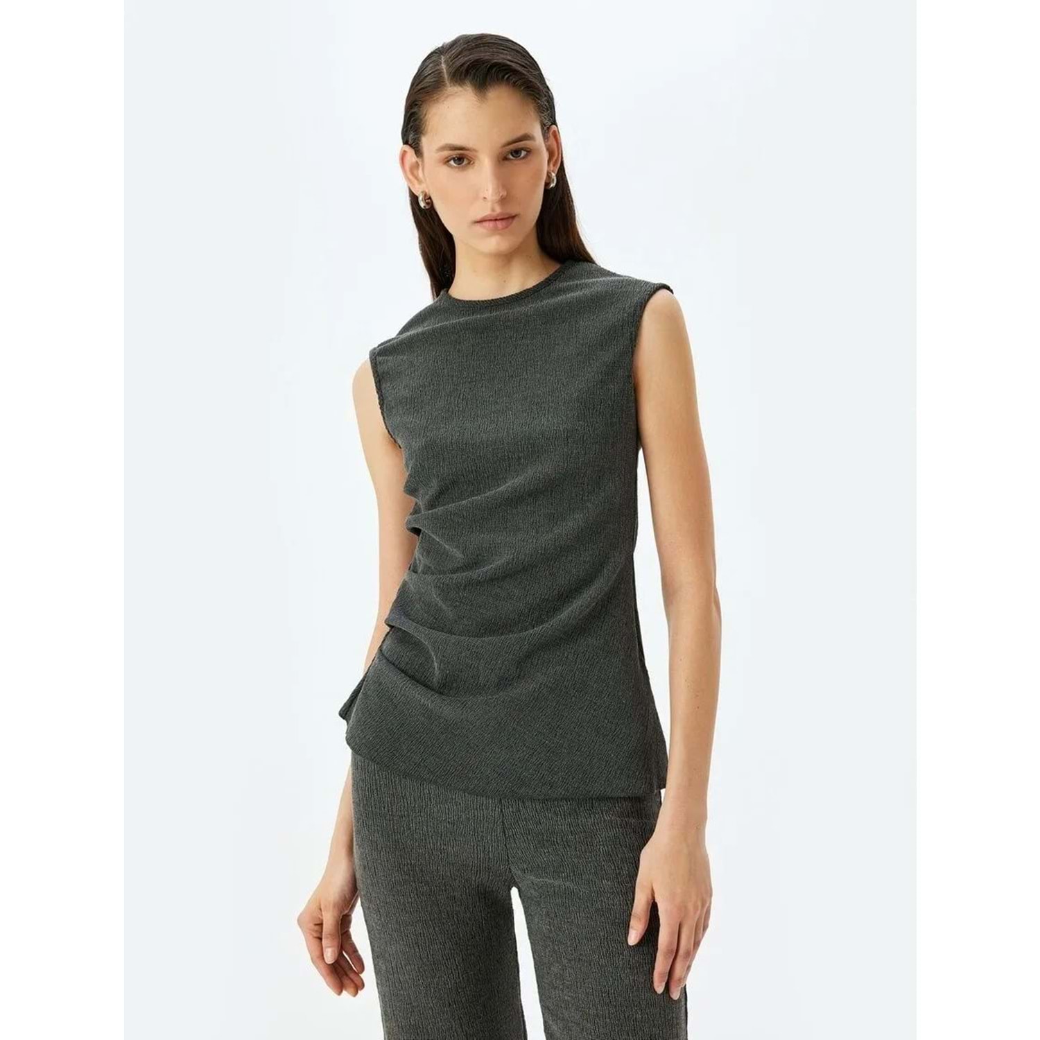 Yuvarlak Yaka Drape Detaylı Asimetrik Kolsuz Tişört 5SAK50005EK - KOTON - ANTRASİT - M