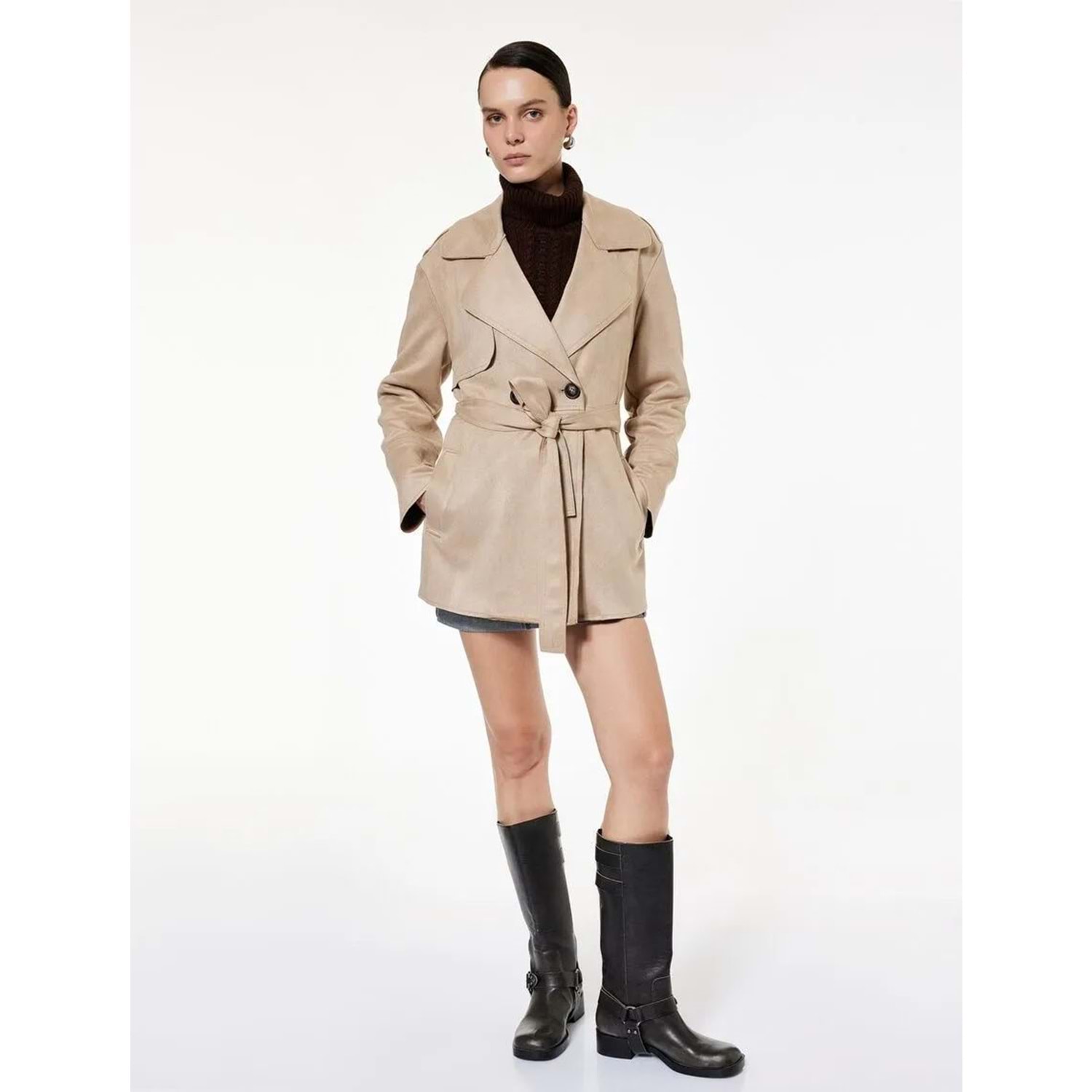 Cepli Düğmeli Uzun Kollu Kruvaze Kemerli Suni Süet Trençkot - 6WAK20251EW - BEJ - 36