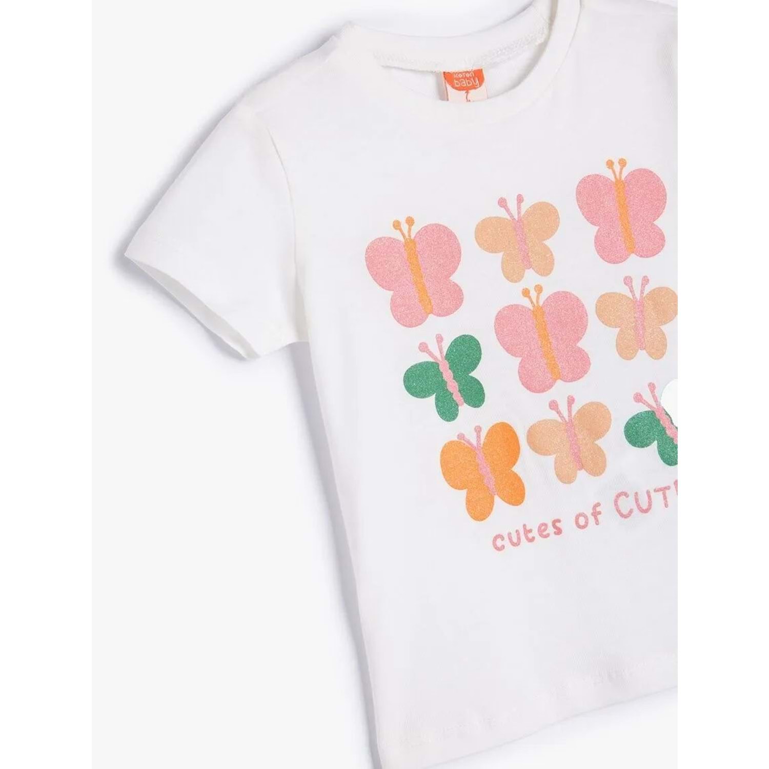Kız Bebek Kelebek Baskılı Bisiklet Yaka Kısa Kollu Pamuklu Tişört 5SMG10026AK - KOTON - EKRU - 9-12 AY