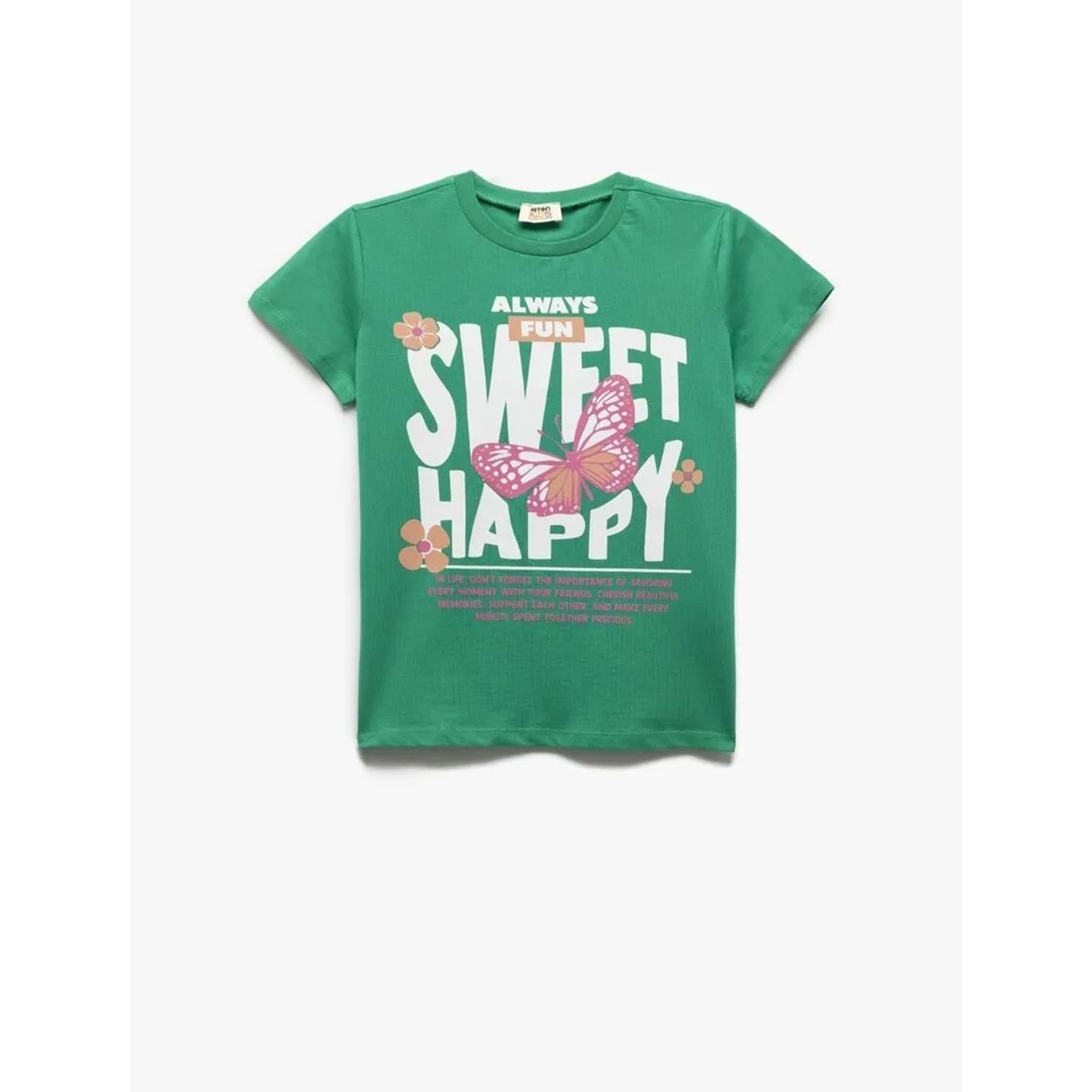 Kız Çocuk Kelebek Baskılı Bisiklet Yaka Pamuklu Kısa Kollu Tişört - KOTON - YEŞİL - 4-5 YAŞ